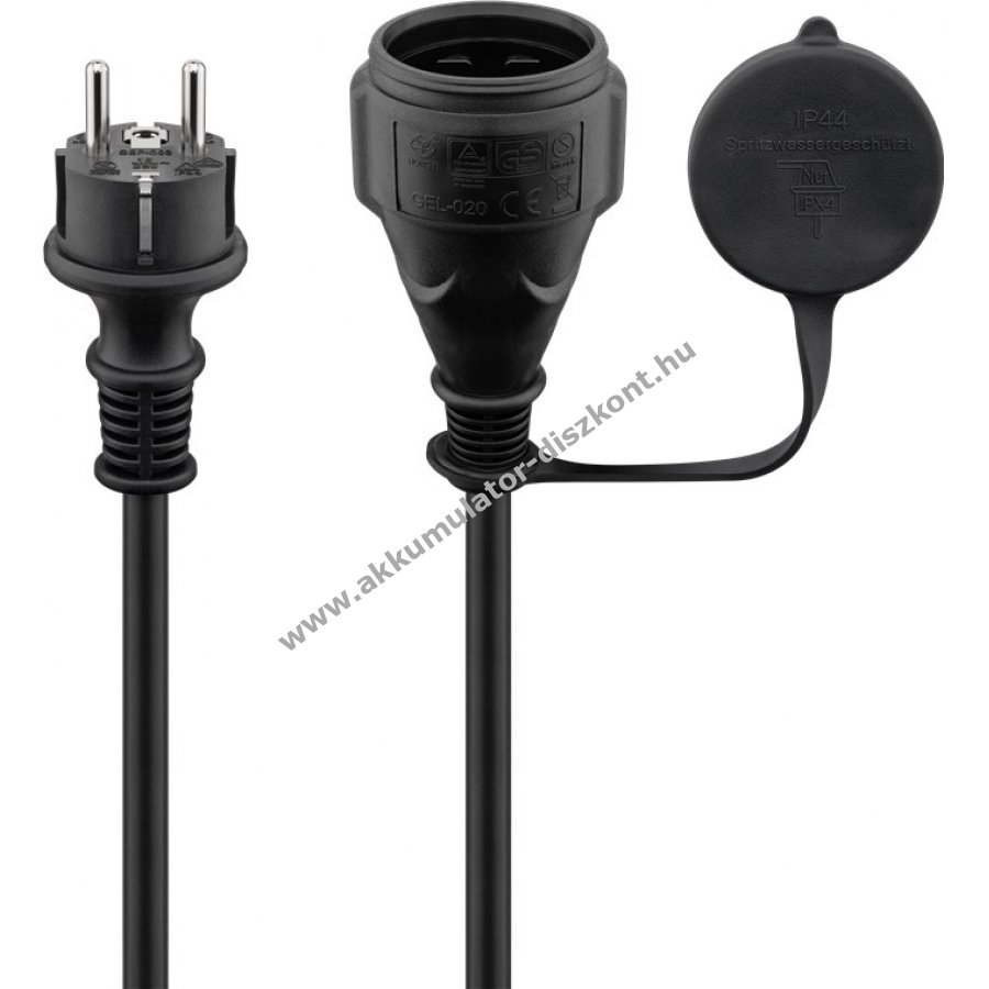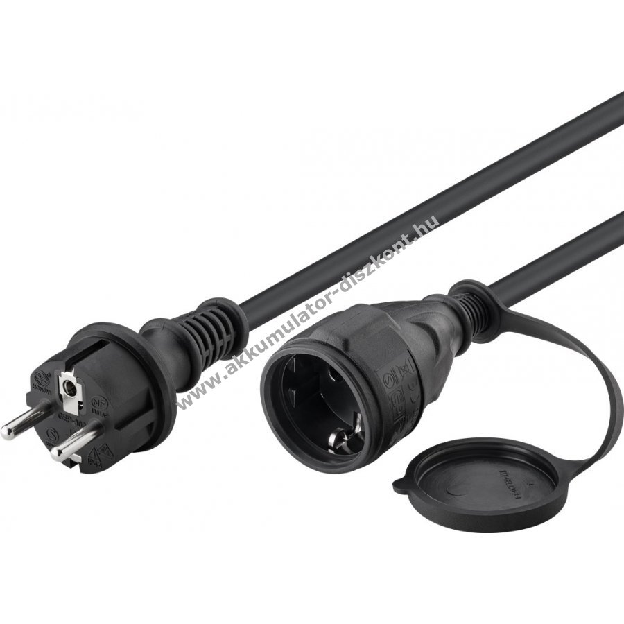 Kültéri használatra alkalmas hosszabbító kábel 10 m hosszban fekete színben. 3x1,5 mm2 keresztmetszetű nehéz gumibetétes kábel közepes mechanikai igénybevételhez. Védett csatlakozó dugó (Typ E/F) és aljzat (Typ F) kombinációval. IP44 védelem fröccsenő víz ellen, így nedves helyiségekben és szabadban is használható. Ideális háztartási gépekhez, porszívózáshoz, barkácsoláshoz vagy fűnyíráshoz. A csatlakozó aljzaton zárókupak védi a szennyeződéstől és nedvességtől. Olaj-, hő- és hidegálló. Külső átmérő kb. 10,2 mm. VDE és TÜV Rheinland által bevizsgált, 250 V és 16 A mellett legfeljebb 3680 W teljesítményig használható.