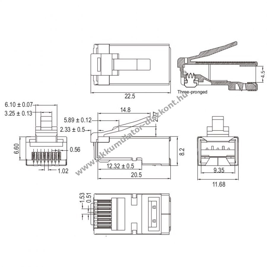 Kiváló minőségű anyagokból készült, masszív műanyag házzal és nikkelezett érintkezőkkel rendelkező LAN csatlakozó.