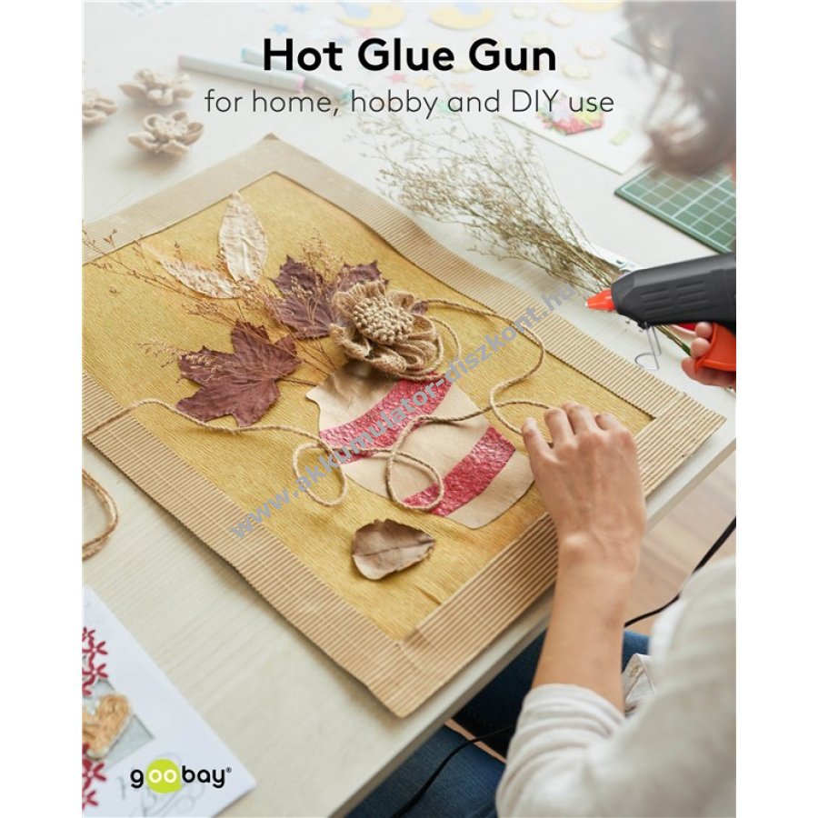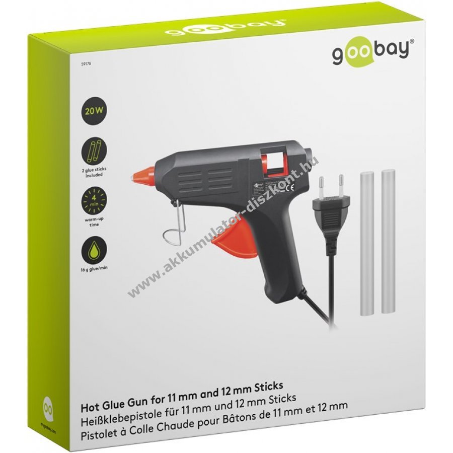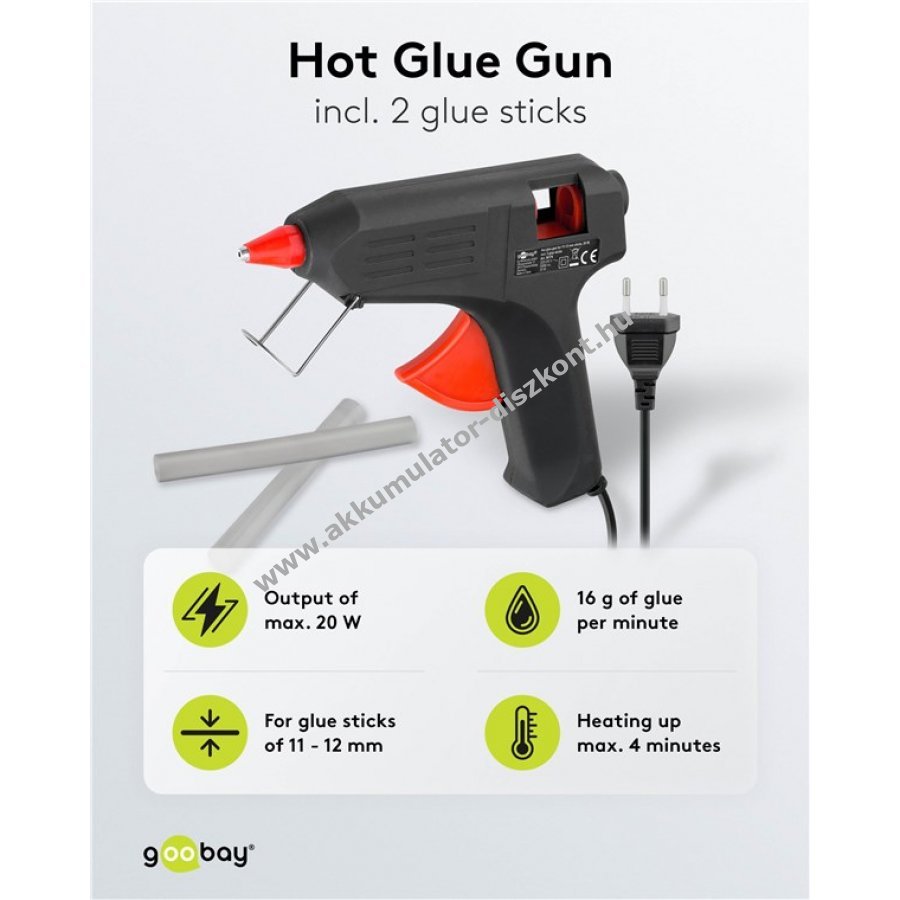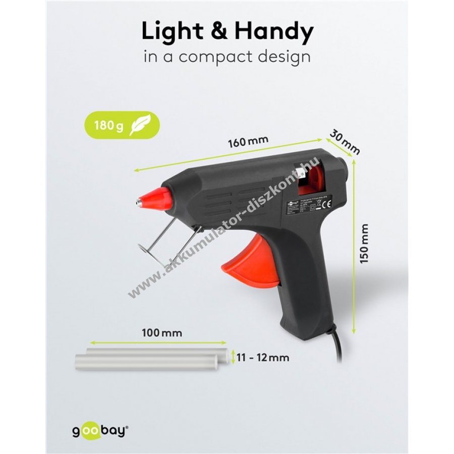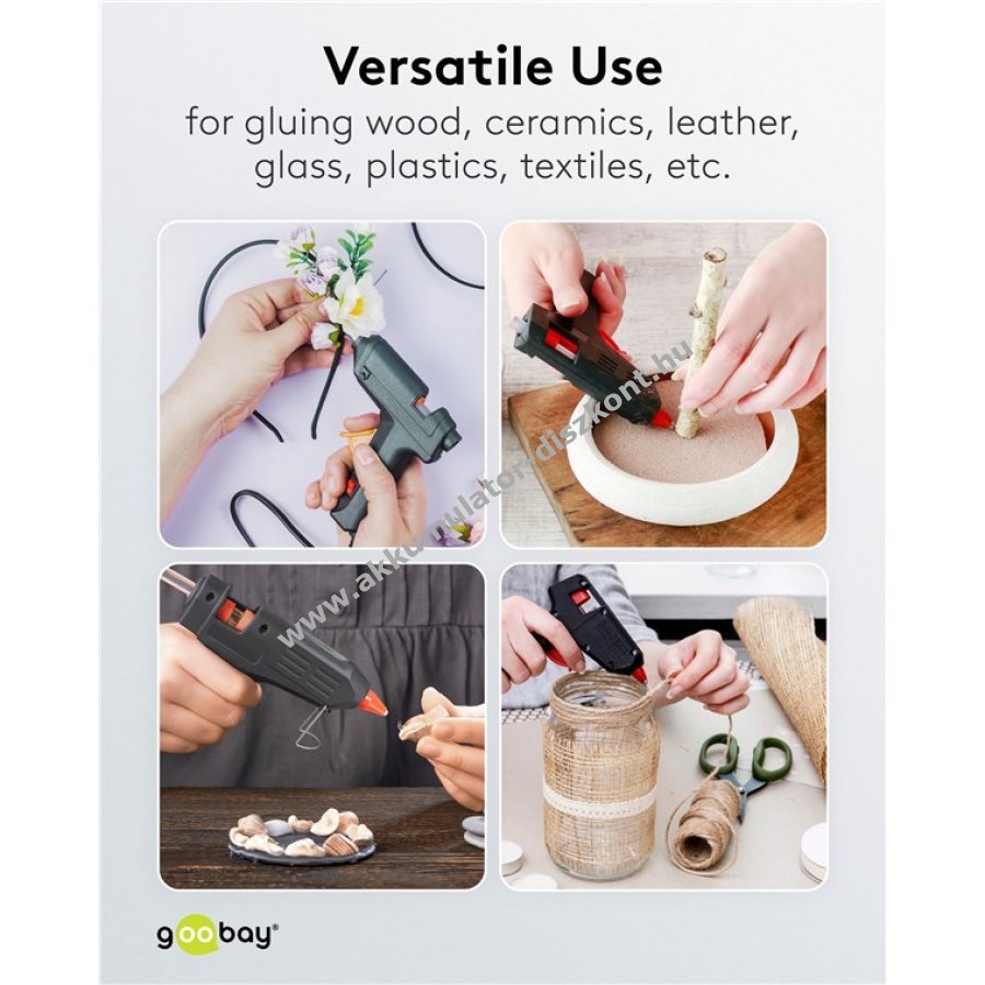 Tiszta ragasztás otthoni hobbi és barkács munkákhoz 20 W teljesítmény 11 mm és 12 mm ragasztórúdhoz Használatra kész legfeljebb 4 perc felmelegedés után Akár 16 g ragasztó felmelegítése percenként Sokoldalúan használható fa kerámia bőr üveg műanyag és textil ragasztására