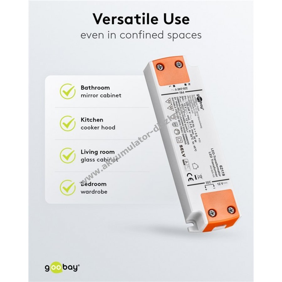 A tápegység állandó 12 V egyenfeszültséget biztosít LED-ek számára, így rugalmasan csatlakoztathatók különböző hosszúságú LED-szalagok. Kompakt kialakítás 5 W minimális terheléssel és előtét elektronikával 200-240 V hálózati feszültséghez.
