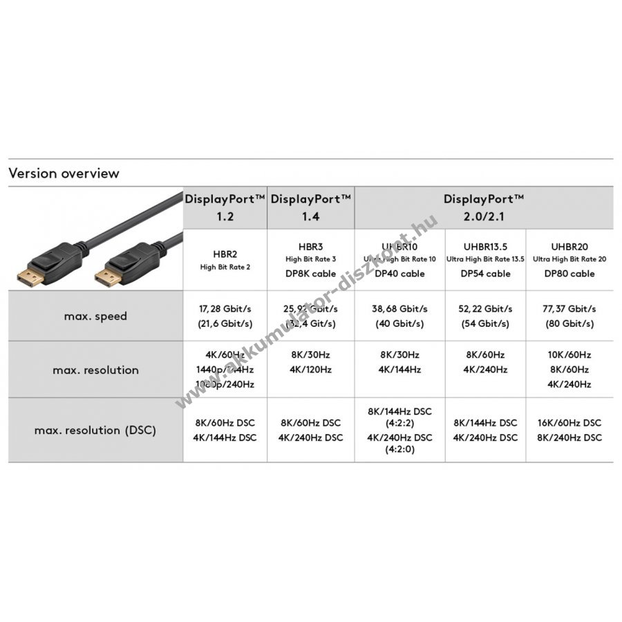 Nagyfelbontású 4K képátvitel 60 Hz-en és 3D támogatás 2560x1600 120 Hz-ig. Kompatibilis Dolby TrueHD és DTS-HD térhangzással. 21,6 Gbit/s maximális adatátviteli sebesség a tökéletes, késleltetésmentes játékhoz és HD streaminghez. Masszív kialakítás számítógépekhez és laptopokhoz képernyő vagy projektor csatlakoztatásához. DisplayPort 1.2 támogatja a Multi-Stream-Transportot (MST) akár három monitor egyidejű csatlakoztatásához egyetlen kábellel. 8 csatornás HD hangátvitel DTS-HD, Dolby TrueHD és 7.1 térhangzáshoz. HDCP 1.3 védelem a titkosított tartalmak zavartalan továbbításához Blu-ray, streaming vagy konzol esetén.