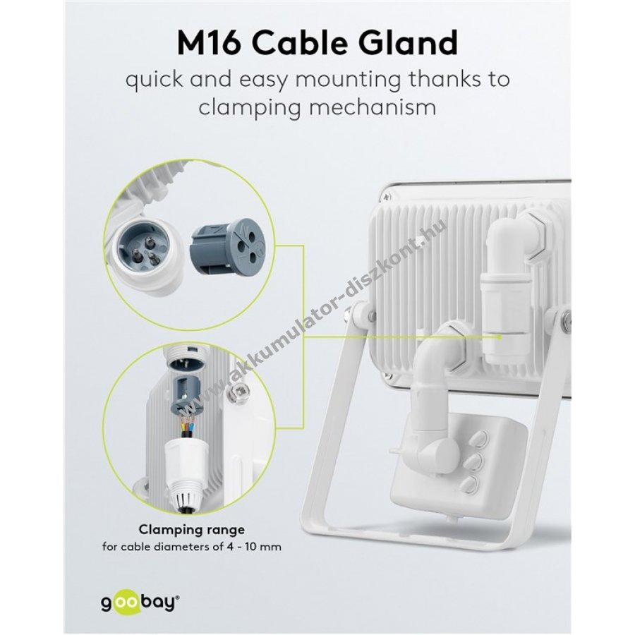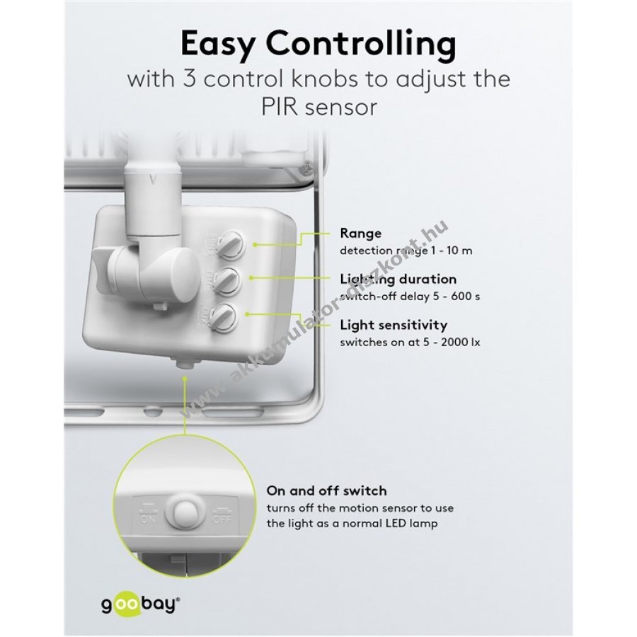 Nagyon fényes és praktikus LED reflektor kompakt kialakítással kültéri használatra. Kiválóan alkalmas házbejáratok, garázsok, kocsibeállók, homlokzatok és járdák megvilágítására. Ideális kerti reflektorként. Gyors és egyszerű felszerelés M16-os kábelcsatlakozóval, 4-10 mm kábelátmérőhöz. A PIR mozgásérzékelő maximális érzékelési távolsága 10 m 180°-os szögben. Állítható kikapcsolási késleltetés 5-600 másodperc között, fényérzékenység 5-2000 lx és hatótávolság 1-10 m között. A mozgásérzékelő be- és kikapcsolható, így normál kültéri világításként is használható. Stabil, döntött tartókonzol falra szereléshez, akár 180°-os forgatási lehetőséggel. Az ütésálló alumíniumöntvény ház és a keményített üveg hosszú élettartamot biztosít kültéri környezetben. Az LED reflektor akár 80%-kal energiatakarékosabb a halogén reflektorokhoz képest.