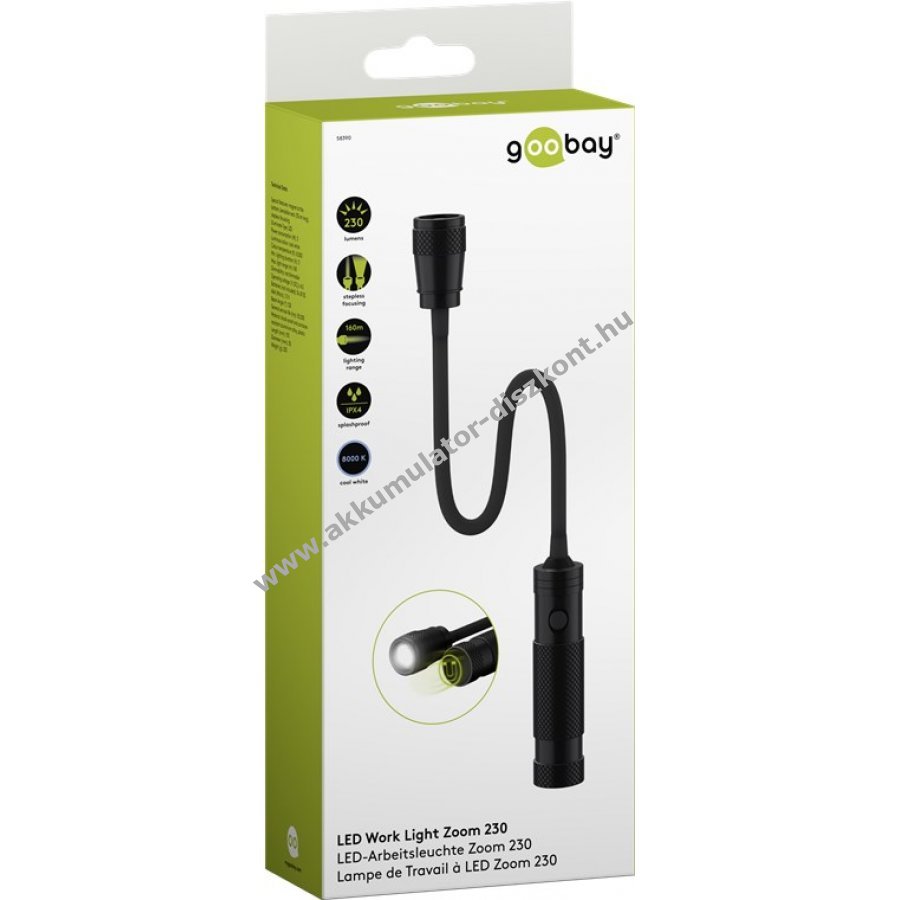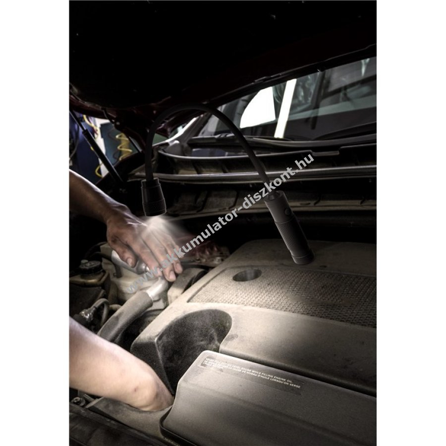 A Goobay LED munkalámpa mágneses talppal beltéri és kültéri használatra ideális világítást biztosít a munkaterületen kényelmes munkavégzéshez. Sokoldalúan használható, mert fém felületeken tapad. 33 cm hosszú hajlítható nyak pontos megvilágítást tesz lehetővé. Nagyon fényes 3 W teljesítményű lámpa 230 lm fényerővel és akár 160 m-es fényhatótávolsággal. A lámpafej csúszkás mechanizmussal fokozatmentesen állítható fénykúppal rendelkezik. Az alján elhelyezett mágneses tartó kényelmes és rugalmas rögzítést biztosít például jármű karosszériáján. A műhelylámpa IPX4 szabvány szerint fröccsenő víz ellen védett. Ütés- és korrózióálló alumíniumötvözetből készült, ezért műhelyekben és segélyszolgálatoknál egyaránt használható. A LED munkalámpa 3x AAA (mikroelem) elemmel működik, melyek nem tartozékok.