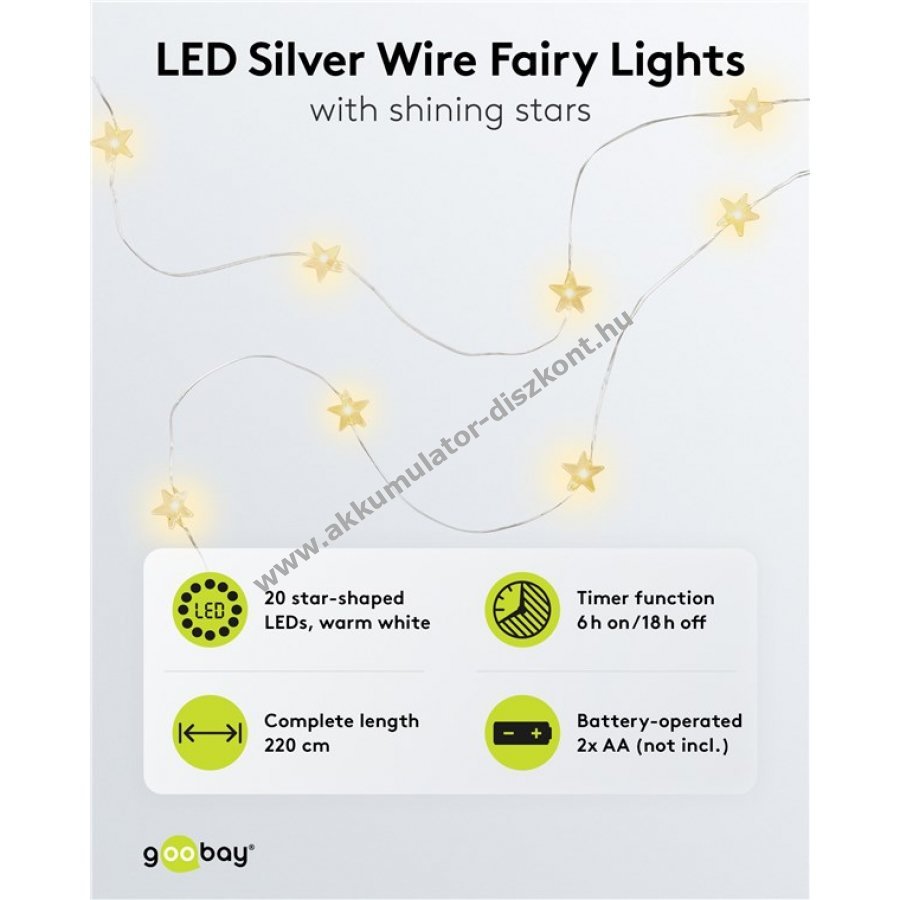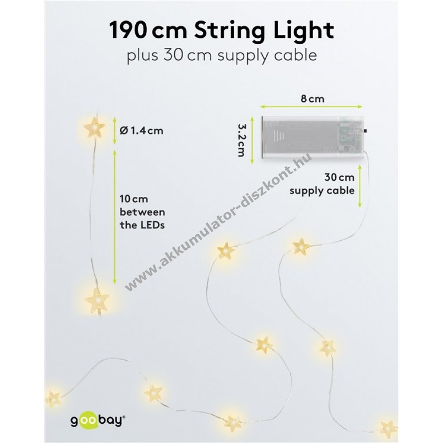 Teljes hossz 2,20 m, átlátszó tápvezeték 30 cm, LED-ek távolsága 10 cm, csillagok átmérője 1,4 cm, anyaga műanyag.