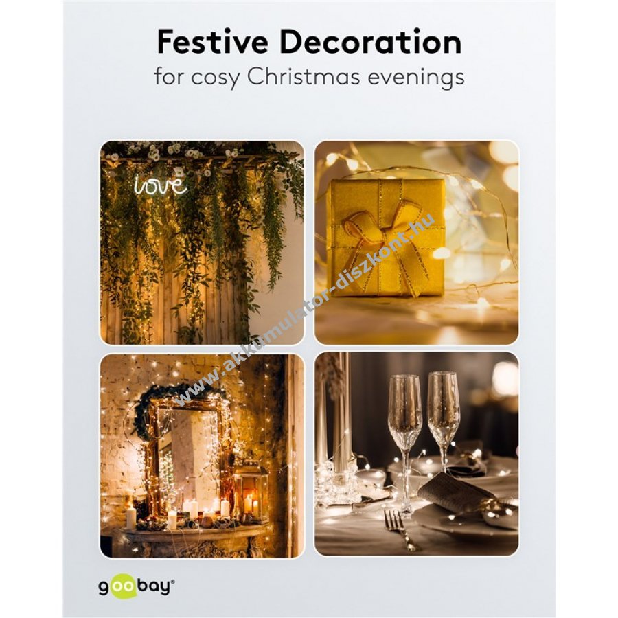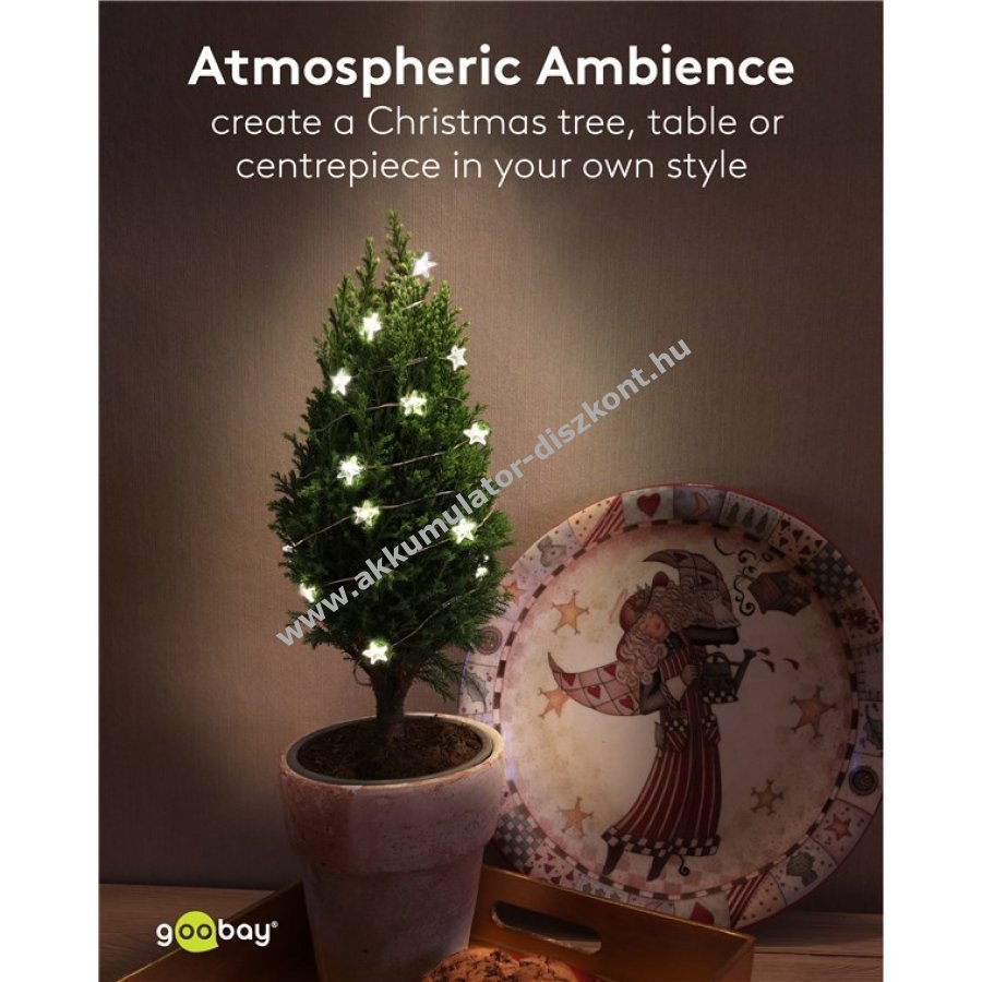 A fényfüzér elemmel működik és rugalmas fém drótjának köszönhetően könnyen formázható dísztárgyakba karácsonyra vagy esküvőre.