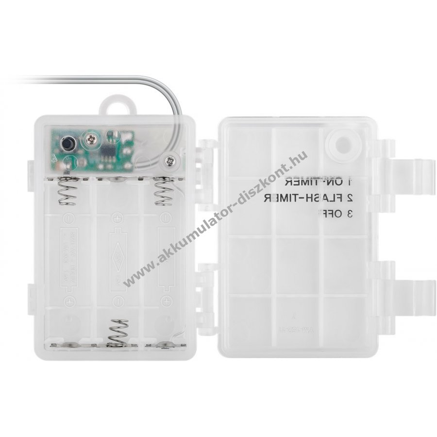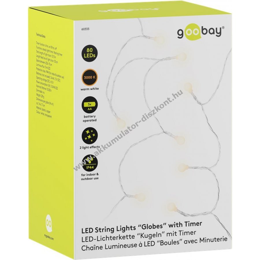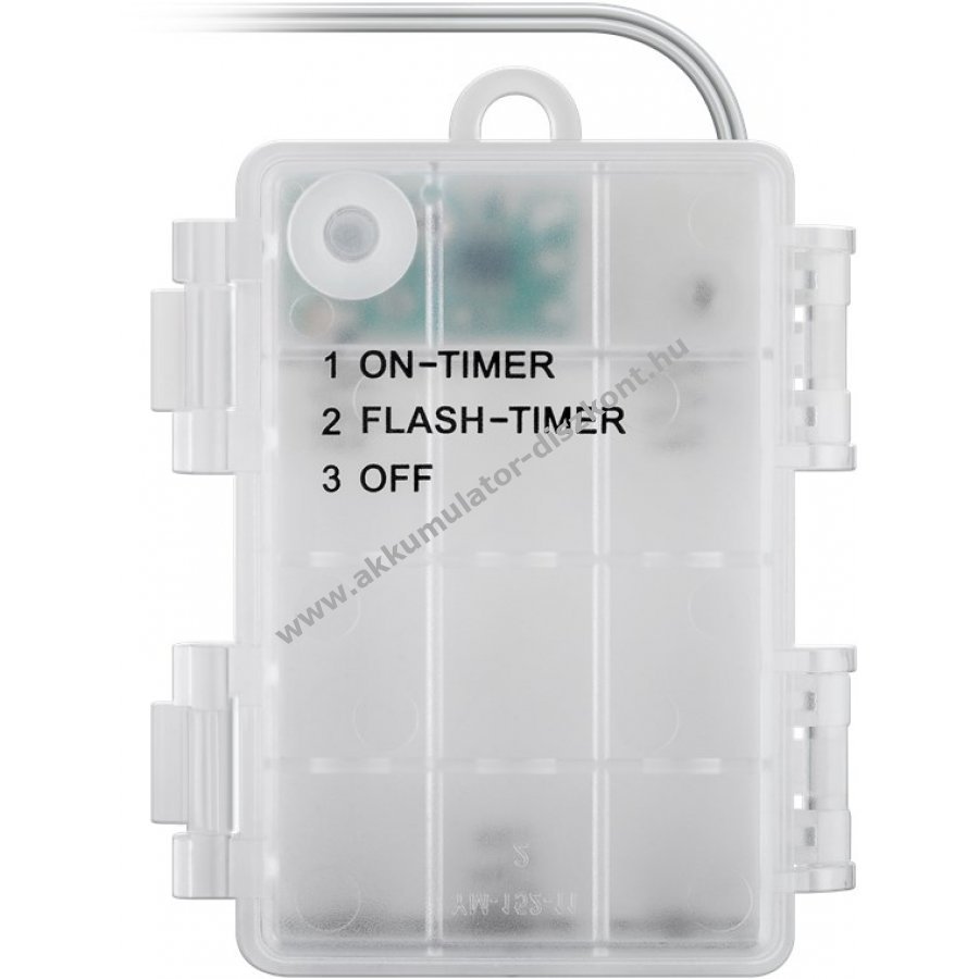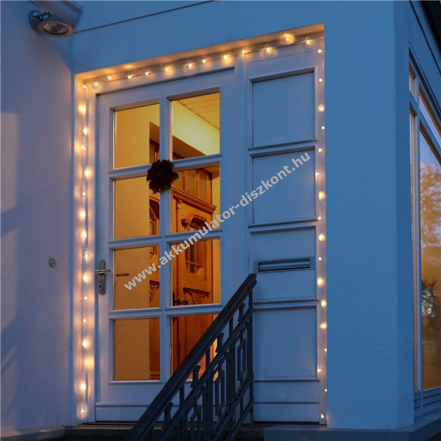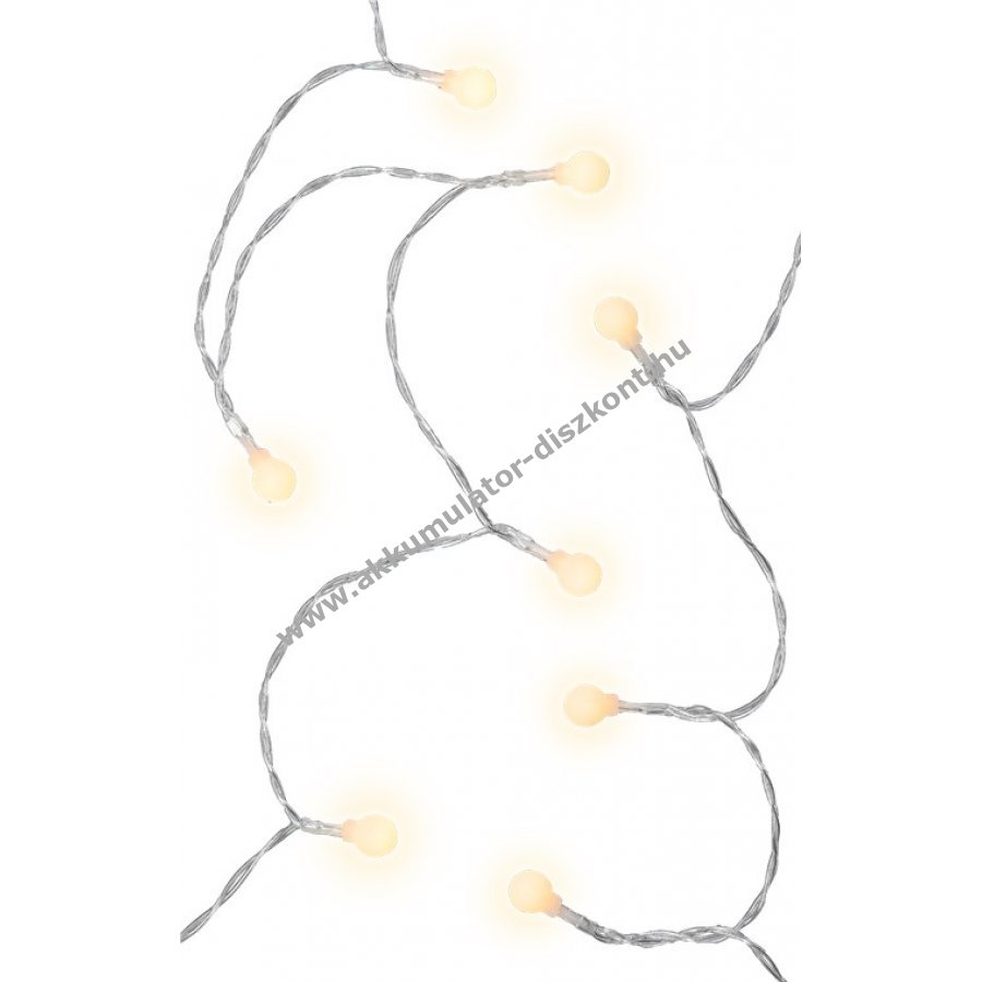 Elemmel működő LED fényfüzér melegfehér világítással beltéri és kültéri használatra IP44 védelemmel. Kiváló dekoráció növényekhez bútorokhoz függönyökhöz és falakhoz. Hangulatos fényt ad ünnepekre karácsonyra születésnapra esküvőre és szabadidős tevékenységekhez kempingezéshez. 6 órás bekapcsolás 18 órás kikapcsolás időzítővel. Kapcsoló három állással: folyamatos fény időzítővel villogó fény időzítővel és ki. Elem nélkül 3 darab AA elemmel működik. Teljes hossz 12,15 m bekötő vezeték 30 cm LED távolság 15 cm. Áttetsző kábel matt fehér műanyag gömbök átmérője 1,4 cm.