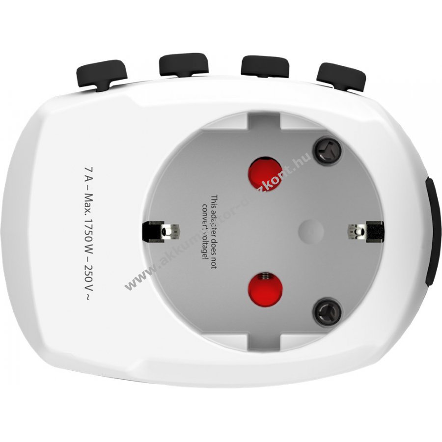 Hat hálózati csatlakozó UK, USA/Japán, Ausztrália/Kína, Olaszország, Brazília és Svájc számára csúszkával váltható.