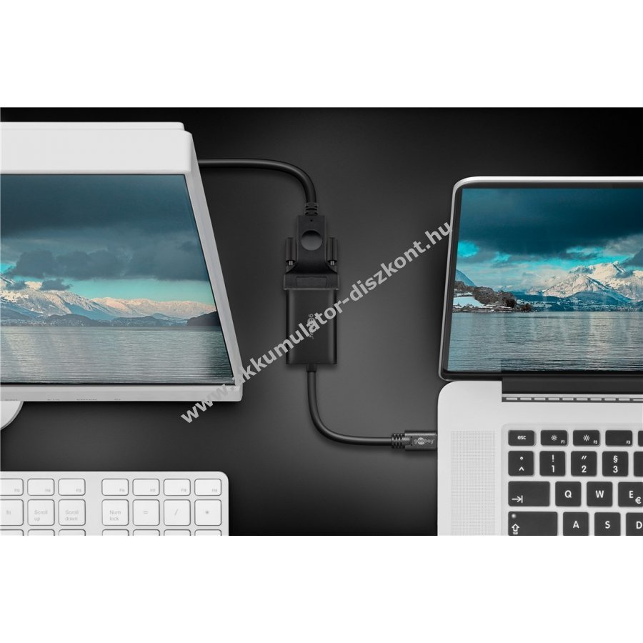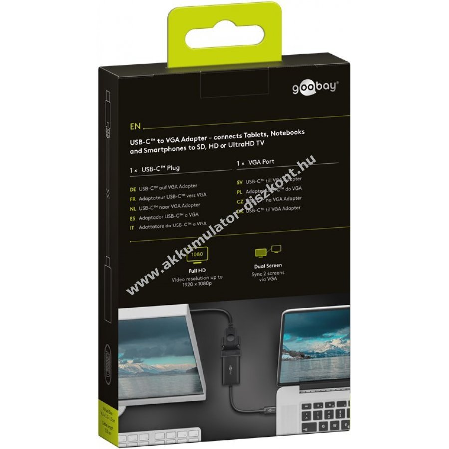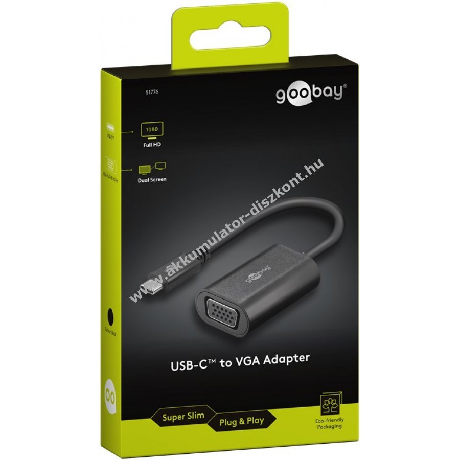 A Goobay USB-C VGA adapter USB-C jeleket VGA eszközökre tükröz. Egyszerű használatot biztosít és támogatja a Full HD felbontást 1920 x 1080p 60 Hz-en.