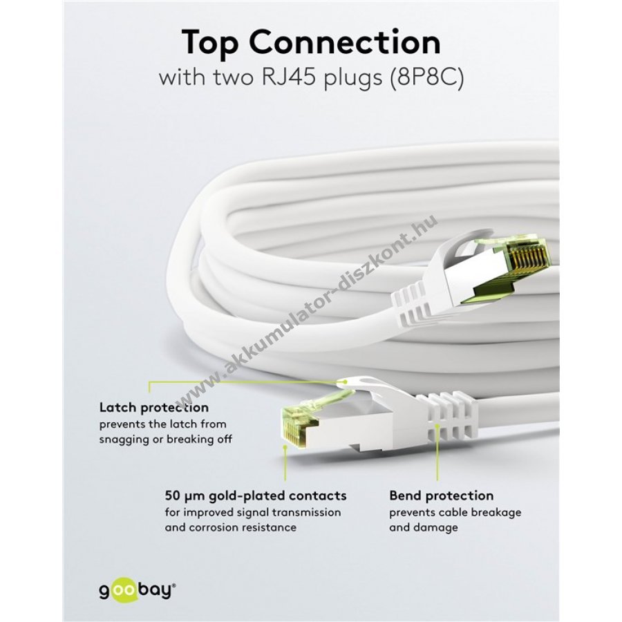 GHMT tanúsítvánnyal rendelkező CAT 8.1 patchkábel 2 m hosszban fehér színben halogénmentes LSZH kábelköpennyel. 24 m-es vezetékes hálózati szakaszokhoz, 2 csatlakozós csatornán tesztelve 2 GHz-ig az ANSI/TIA-568.2-D szabvány alapján. 25GBase-T és 40GBase-T Ethernet támogatás, kompatibilis 10BASE-T, 100BASE-TX és 1000BASE-T hálózatokkal. 2000 MHz sávszélesség, négyszerese a CAT-6A kábelekének. S/FTP árnyékolás egyedi alumínium fólia és háló kombinációval. Mindkét végén RJ45 (8P8C) csatlakozó 50 µm aranyozott érintkezőkkel és reteszelő védelemmel. Power over Ethernet (PoE, PoE+, UPoE, 4PPoE) és HDBaseT kompatibilis. Alacsony füstképződésű, halogénmentes kábelköpeny.