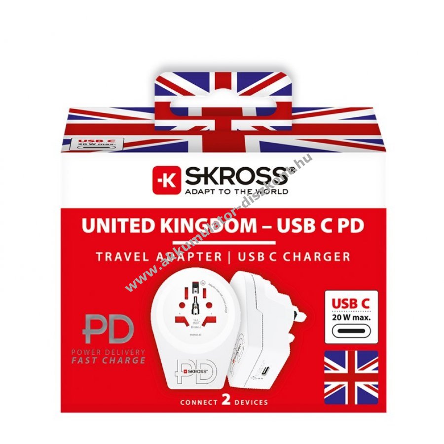 Az angol csatlakozó szabvány több mint 50 országban használatos. A Skross World to UK USB-C PD adapterrel egyszerűen és megbízhatóan csatlakoztathatók a 2- és 3 pólusú földelt és föld nélküli készülékek. Egyidejűleg gyorsan tölthetők USB-C Power Delivery kompatibilis eszközök.