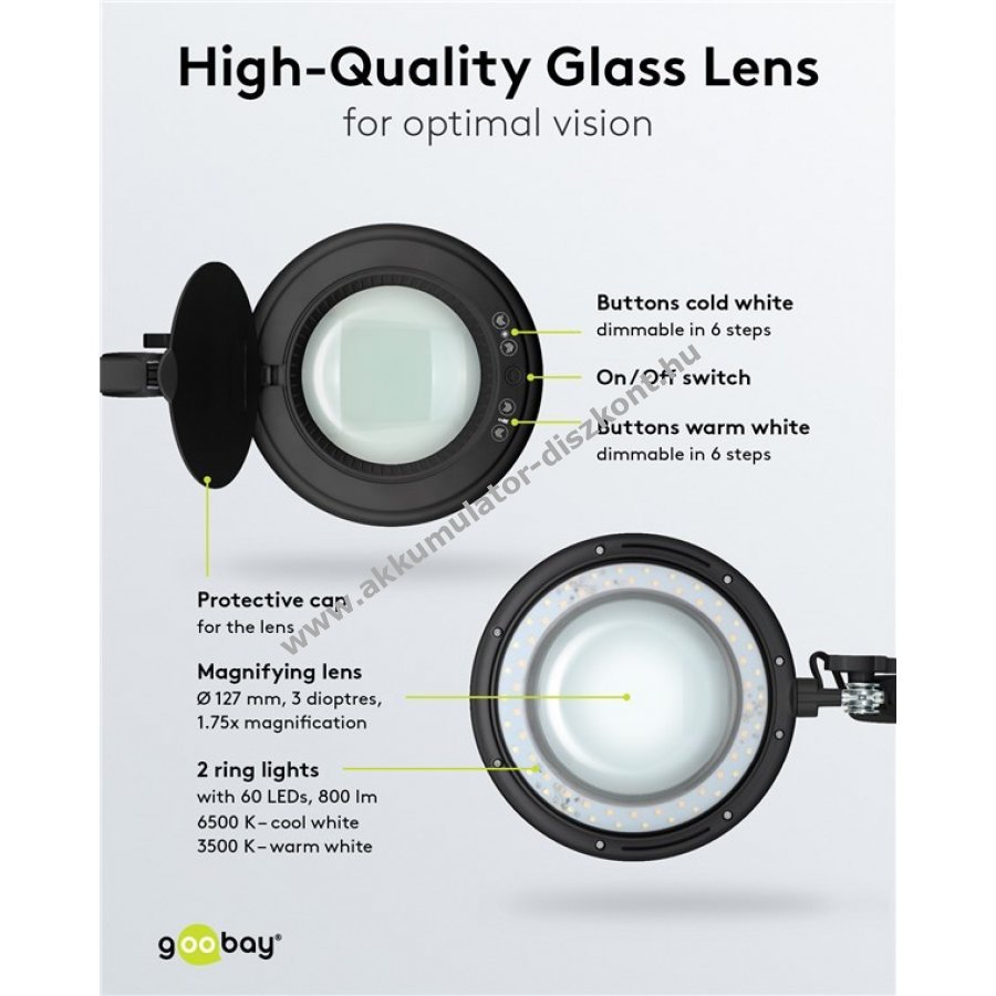 A nagyítólámpa fényereje és fényszíne külön érintőpanelen 6 fokozatban állítható 3500-6500 K között maximum 800 lm teljesítménnyel