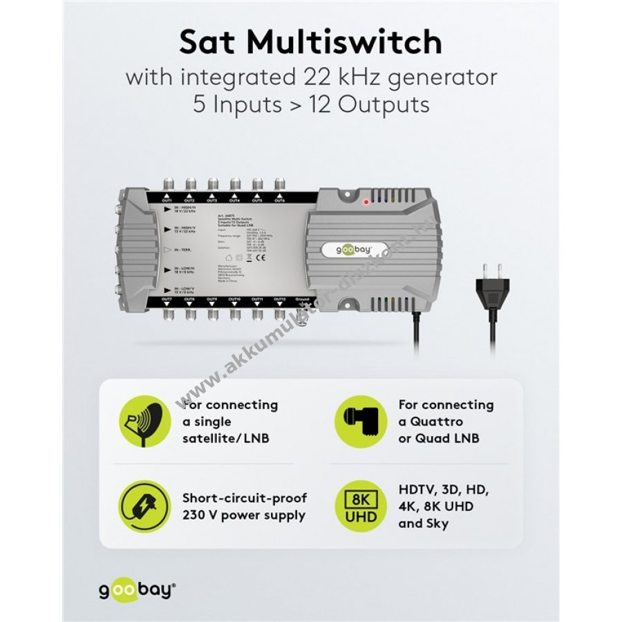 Beépített 22 kHz-es jelgenerátorral rendelkezik és kompatibilis Quattro-LNB és Quad-LNB típusokkal.