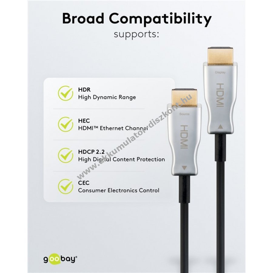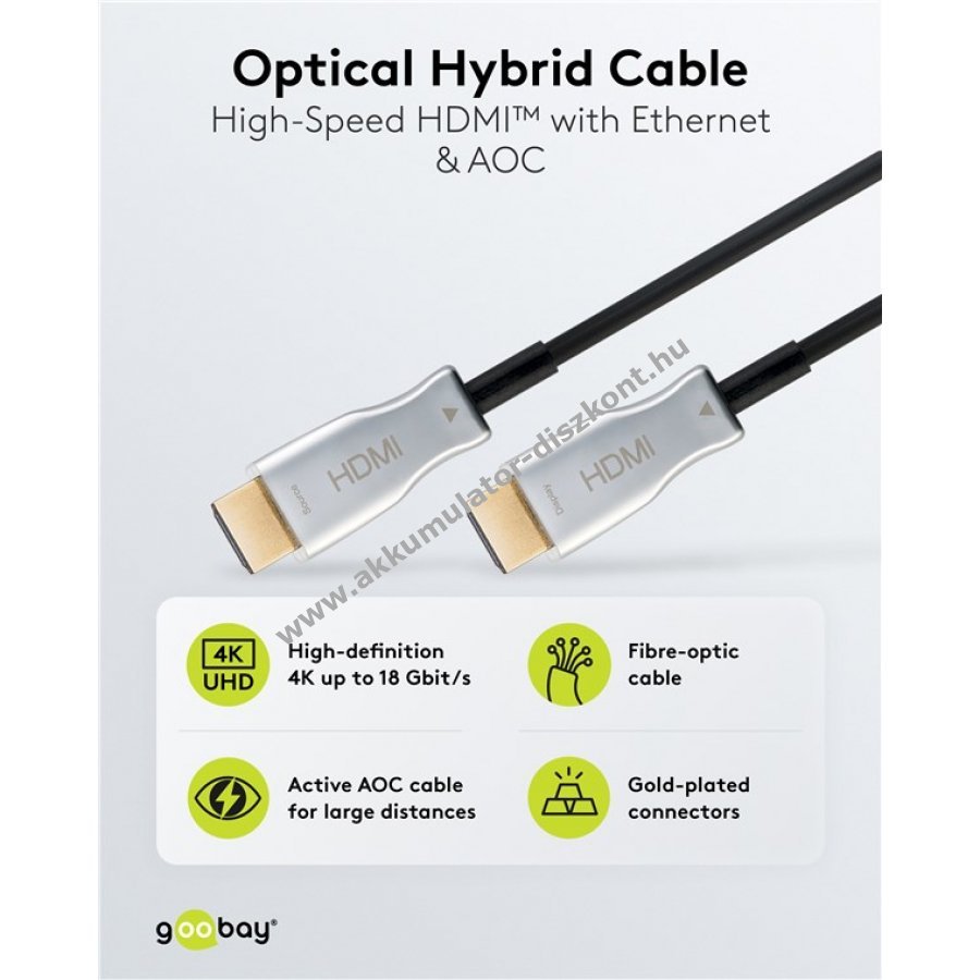 Az optikai High-Speed HDMI kábel akár 100 m távolság áthidalására alkalmas és nagyobb rugalmasságot valamint gyorsabb adatátvitelt biztosít, mint a hagyományos réz kábelek. 4K UHD felbontás támogatása 60 Hz-en (2160p), maximális adatátviteli sebesség 18 Gbit/s, valamint ARC, HDCP, 3D és EDID funkciók. Hibrid kialakítású AOC (Active Optical Cable) technológiás üvegszálas és réz vezető a zavartalan jelátvitelért. Az üvegszálas kábel elektromos jeleket optikai jelekké alakít át, majd a kábel végén vissza elektromos jellé (egysávos). Kompakt, strapabíró fém csatlakozók hajlításvédővel szűk helyeken is. Alkalmas TV-k, monitorok, játékkonzolok (PlayStation, Xbox), vetítők és streaming eszközök (Amazon Fire TV, Apple TV) összekötésére. Az üvegszálas anyag nagyfokú hajlékonyságot és kis hajlítási sugarat biztosít.