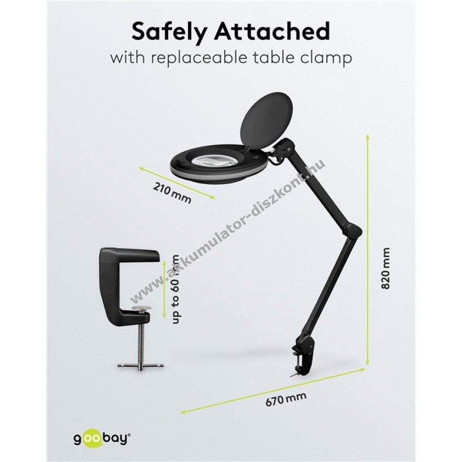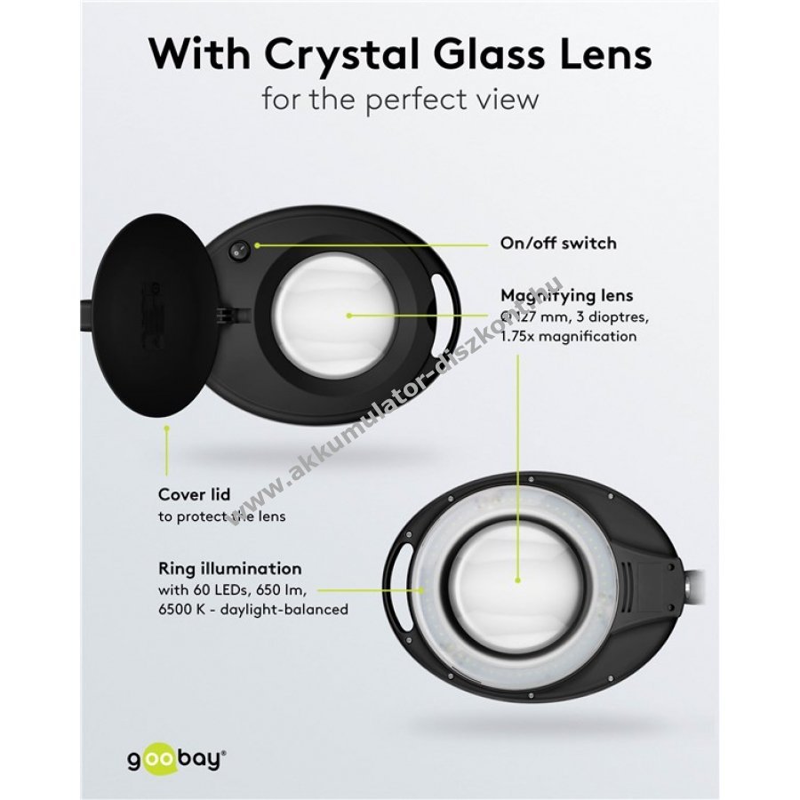 LED csíptetős nagyító lámpa 127 mm átmérőjű kristályüveg lencsével és 3 dioptriával 1,75-szörös nagyítással