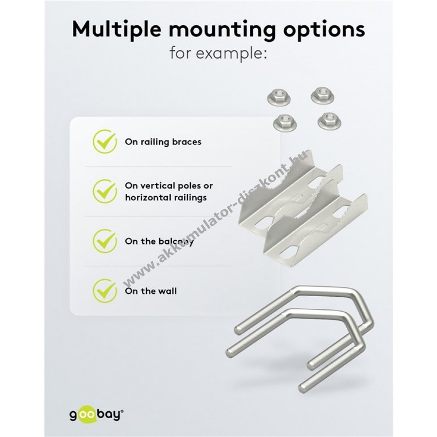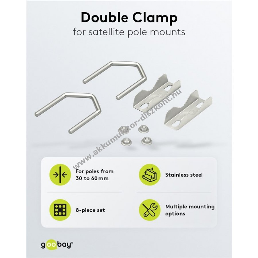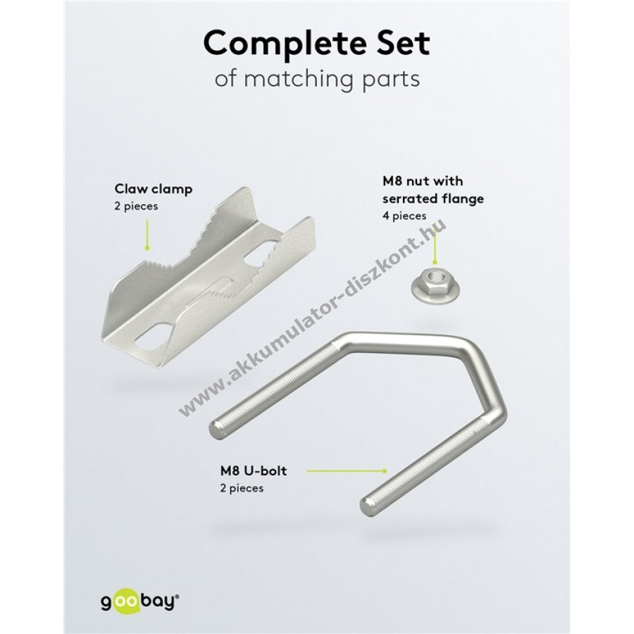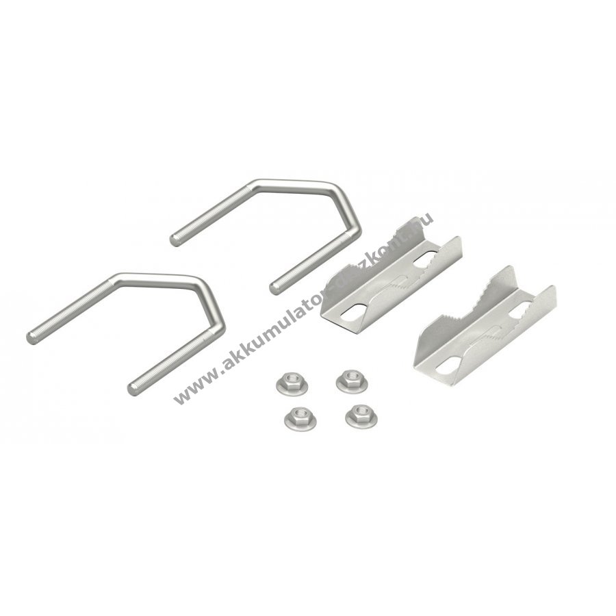 Cinkezett acélból készült bilincsek műhold tartók biztonságos rögzítéséhez erkélykorláton vagy csöveken Külső használatra alkalmas M8 menetes U-alakú bilincsek 8 mm menettel és 70 mm furattávolsággal Két fogazott bilincs kb. 2 mm anyagvastagsággal Tartozék 4 db M8 csavaranya peremes és reteszes kialakítással Csövek és oszlopok átmérője 30-60 mm között