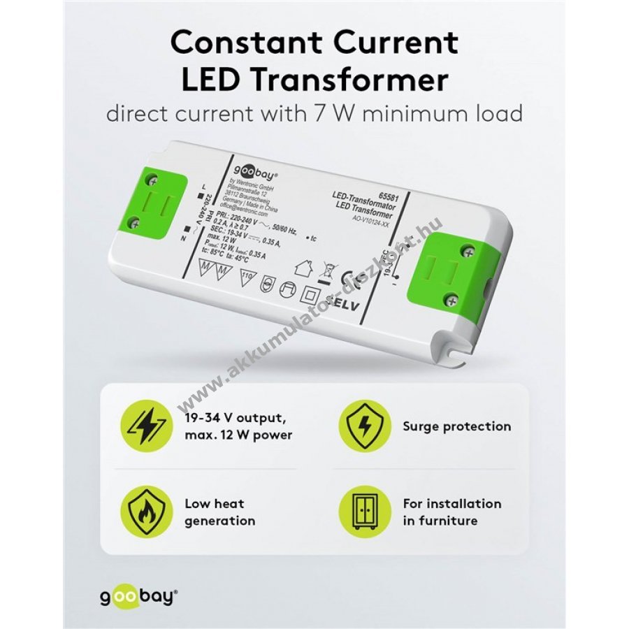 A trafó 7 W minimális terheléssel és előtét elektronikával rendelkezik a szabványos LED lámpákhoz, például spotokhoz és beépíthető világításhoz.