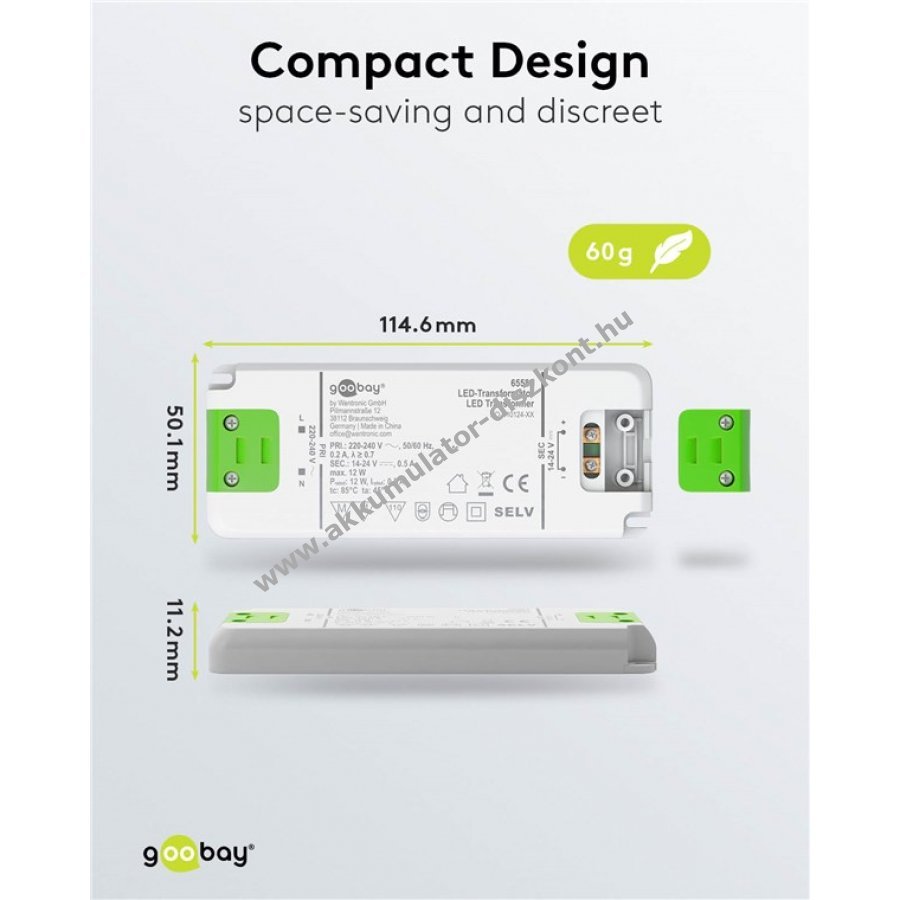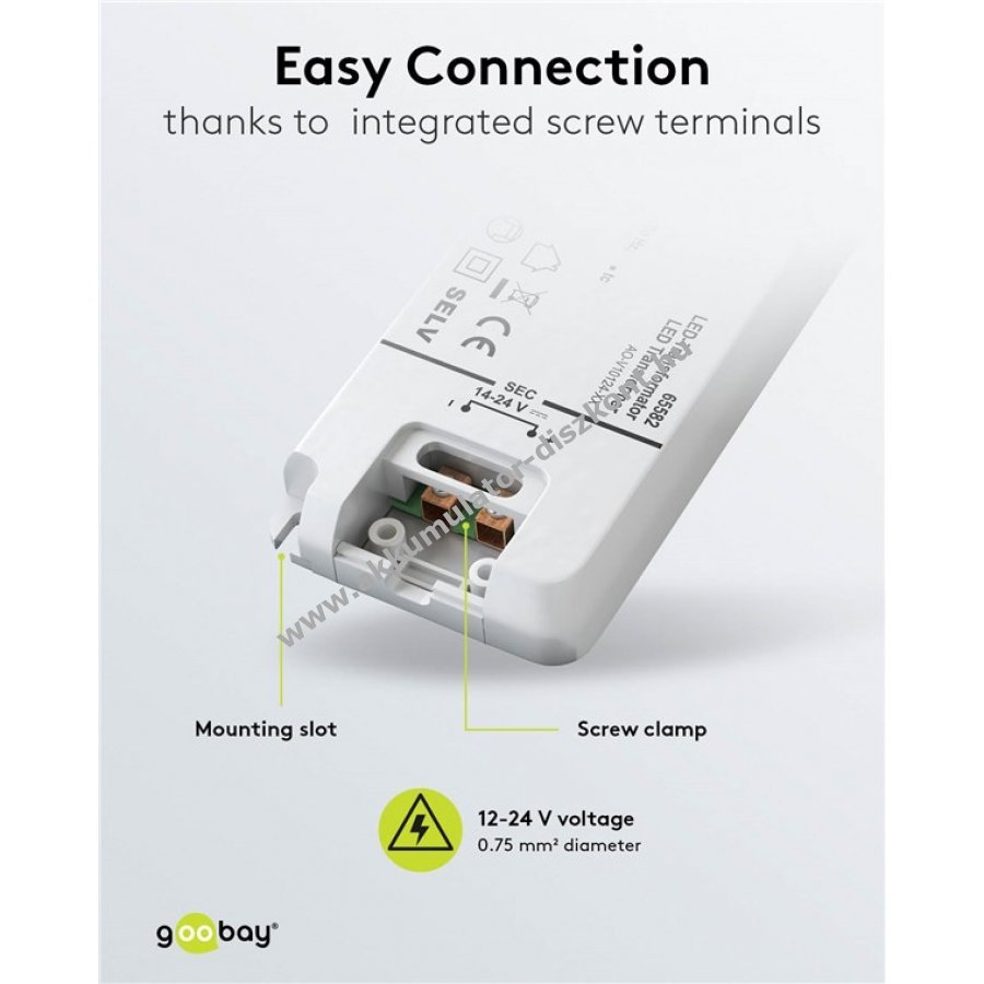 Az állandó áramú trafó stabil 500mA áramot biztosít LED-eknek 14-24V DC feszültségtartományban és akár 12W teljesítményig. Megakadályozza a villogást és a túlmelegedést, így növeli a LED-ek élettartamát. Kompakt kivitel 7W minimális terheléssel és egyszerű csatlakoztatást biztosító csavaros kapcsokkal. Alacsony hőtermelése és lapos kialakítása helytakarékos beépítést tesz lehetővé, például bútorokba vagy szekrények mögé. Alkalmas soros kapcsolásra és beltéri használatra IP20 védelemmel. Elektronikus szigeteléssel védett II. védelmi osztály. Nem dimmelhető.