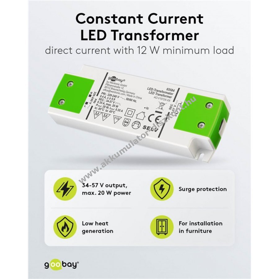A tápegység állandó árammal látja el az LED-eket így hatékonyan megelőzi a villogást és a hő miatti károsodást. A konstansáramú meghajtó biztosítja az egyenletes fényminőséget és fényerőt még soros kapcsolás esetén is.