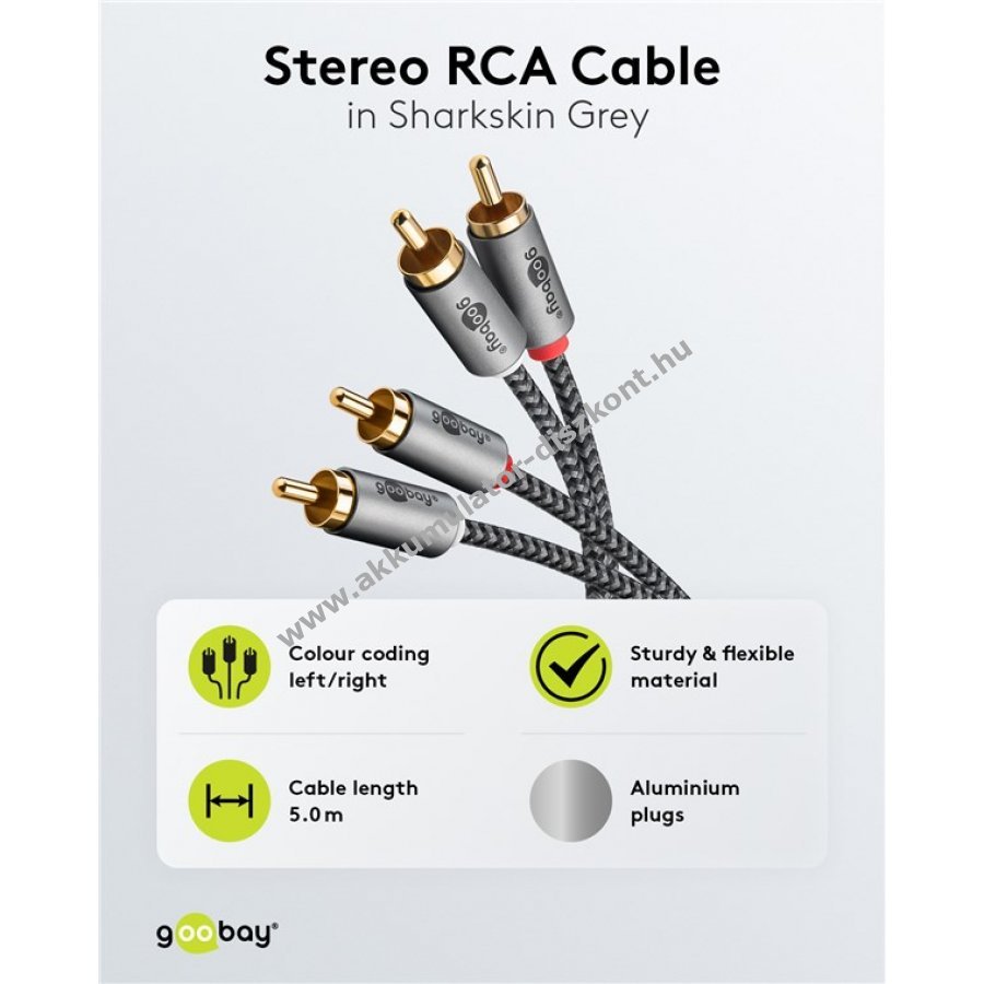 A Goobay Plus sorozat elegáns fém kivitelben Sharkskin Grey színben. Többféle eszköz csatlakoztatására alkalmas, például mélynyomóhoz, Blu-ray lejátszóhoz, keverőpulthoz vagy HiFi rendszerekhez. Tartós és robusztus dugói gyakori csatlakoztatás esetén sem sérülnek.
