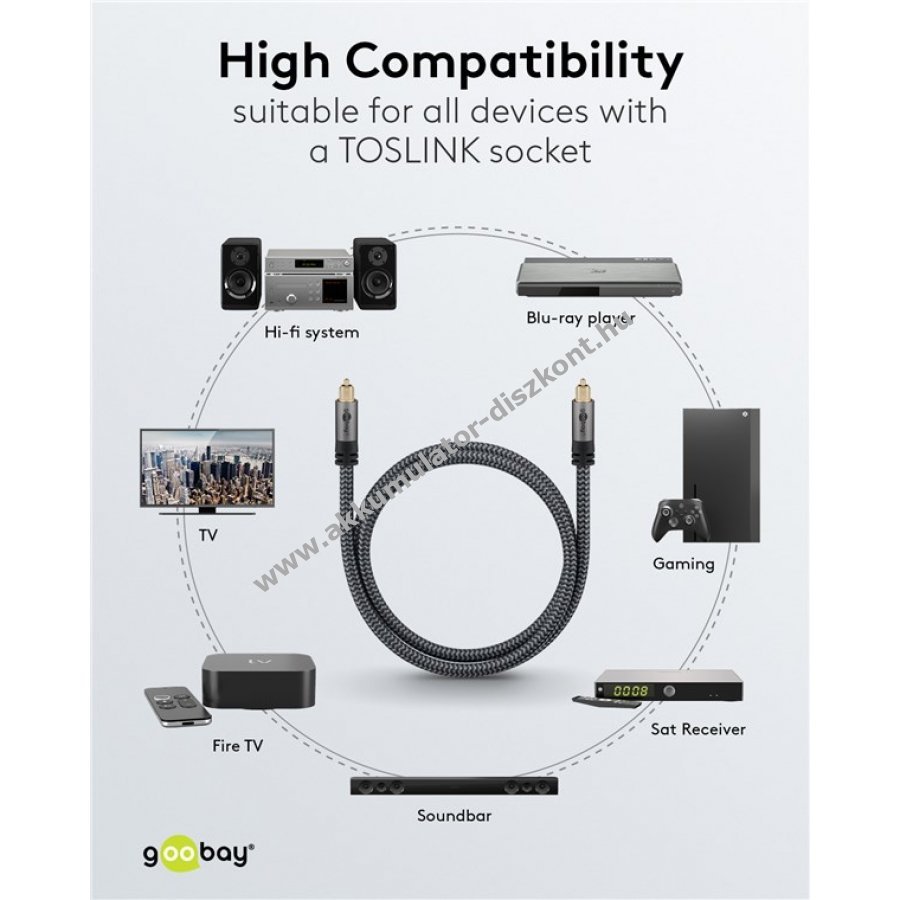 TOSLINK kábel televíziók, játékkonzolok vagy Blu-ray lejátszók és HiFi eszközök, például hangprojektor, erősítő vagy sztereó rendszer összekötésére.