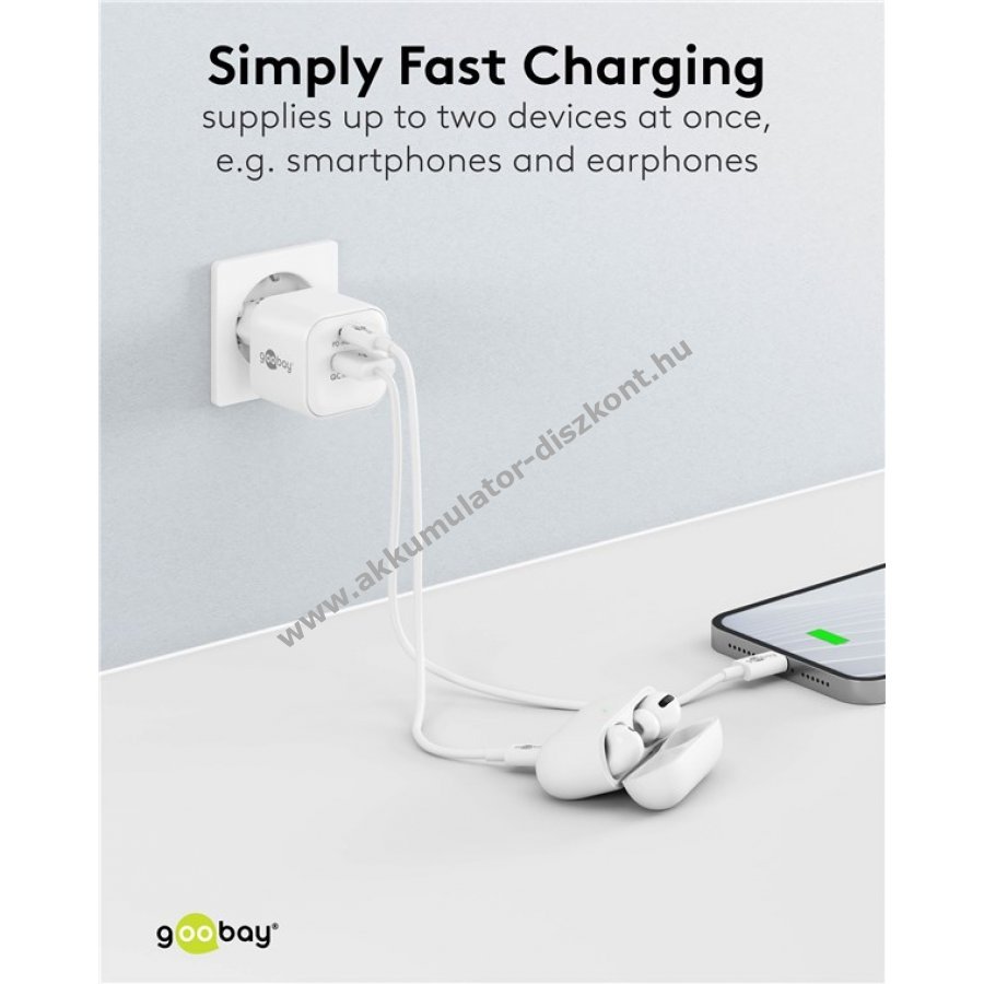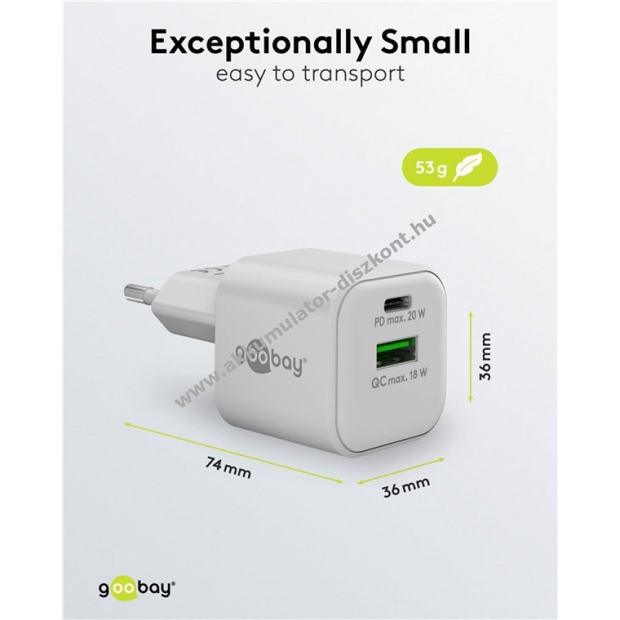 Kis méretű gyorstöltő otthoni és utazási használatra gyors és megbízható töltést biztosít okostelefonoknak és táblagépeknek.