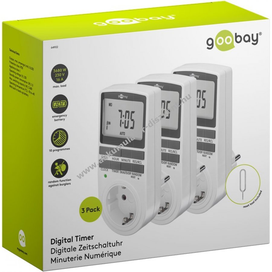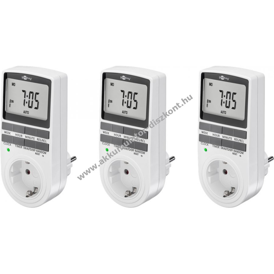 Automatizálja otthonát a Goobay digitális időkapcsolóval kényelmesen szabályozva a fürdőszobai fűtést növénynevelő lámpákat terráriumot és kültéri világítást. 3db csomagban típus F védőérintkezős csatlakozóval.