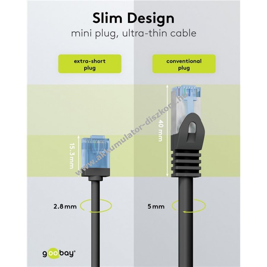 Ultravékony CAT 6A hálózati kábel extrarövid RJ45 csatlakozókkal a kisebb helyigényért szerver szekrényekben és patchpanelekben. Különösen rugalmas a puha TPE burkolat és vékony rézhuzal miatt.