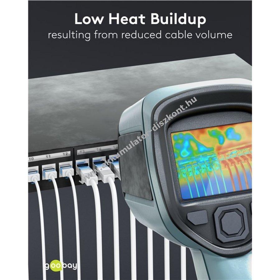 Ultravékony CAT 6A patchkábel extrarövid RJ45 csatlakozókkal a szerver szekrény és patchpanel helytakarékos kábelezéséhez és jobb légáramláshoz.
