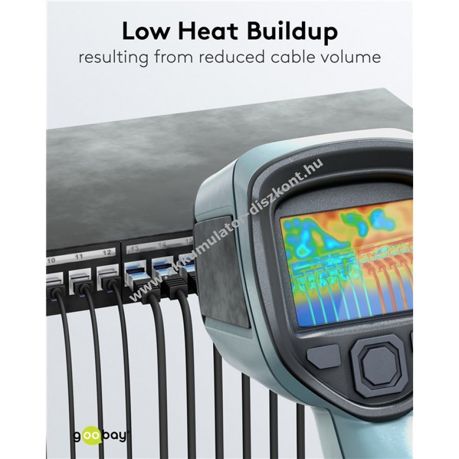 Ultravékony CAT 6A patchkábel extrarövid RJ45 csatlakozókkal a szerver szekrények és patchpanelek anyagigényének csökkentésére és jobb légáramlás érdekében.