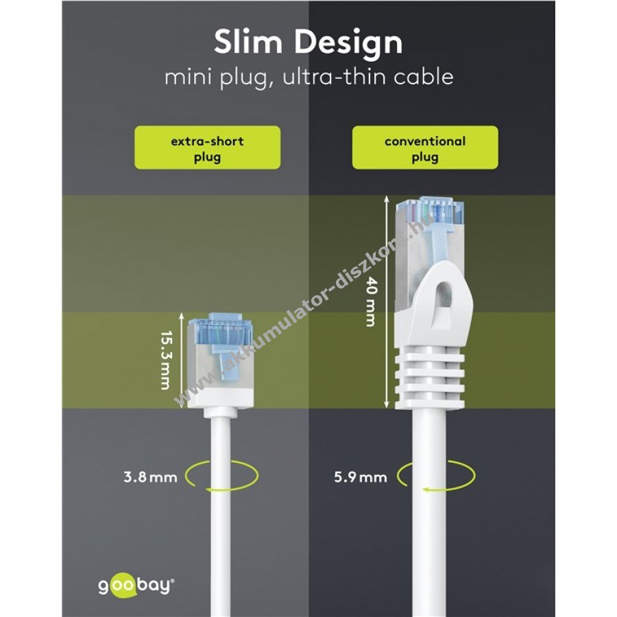 Ultravékony CAT 6A patchkábel extrarövid RJ45 csatlakozókkal a szerver szekrények és patchpanelek kábelterhelésének csökkentésére és jobb légáramlás biztosítására.