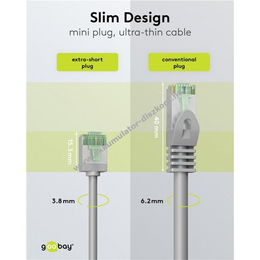 Ultravékony CAT 8.1 patchkábel extrarövid RJ45 csatlakozókkal a kisebb helyigényért szerver szekrényekben és patch panelekben.