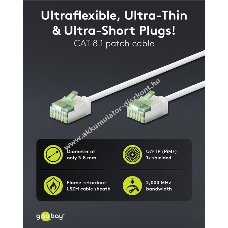 Ultravékony CAT 8.1 patchkábel extrarövid RJ45 csatlakozókkal a szerver szekrények és patchpanelek kábelterének csökkentésére és jobb légkeringésre.