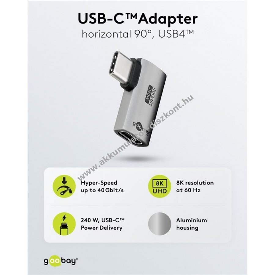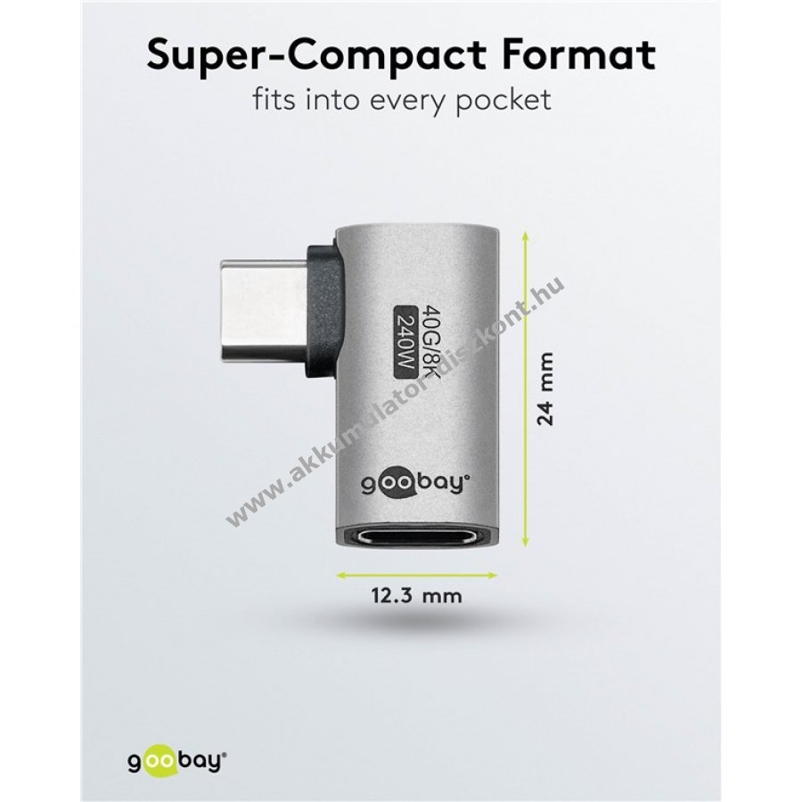 A 90°-os L-alakú USB-C adapter helytakarékos kábelvezetést biztosít szűk helyeken és csökkenti a kábel törését. Különösen alkalmas kis méretű eszközökhöz, mint tabletek Nintendo Switch Steam Deck vagy okostelefonok például Apple iPhone 15 vagy Samsung Galaxy. A kompakt USB-C csatlakozó védi az eszköz portját gyakori töltő vagy adatkábel csatlakoztatás esetén. Támogatja az USB4 szabványt akár 40 Gbit/s adatátviteli sebességgel és 240 W teljesítményt Power Delivery (EPR) töltéshez. Lehetővé teszi a kristálytiszta 8K @ 60 Hz videóminőséget és kompatibilis USB 3.1 USB 2.0 Thunderbolt 3 és Thunderbolt 4 szabványokkal. Masszív fém ház kellemes tapintással és hosszú élettartammal. Szuperkompakt méret amely minden táskában elfér és ideális utazáshoz.