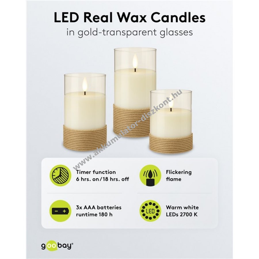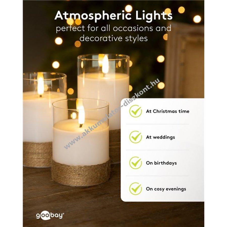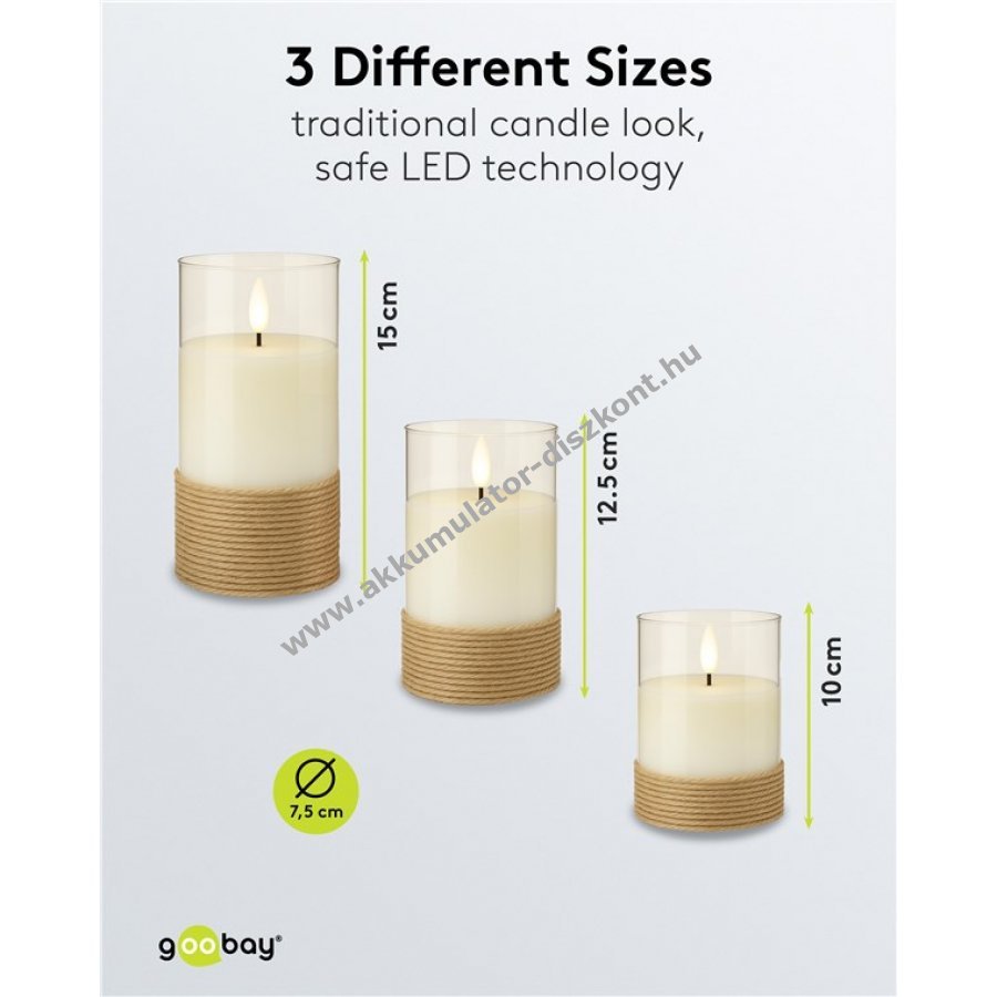 A gyertyák három különböző méretben meleg fehér fényt biztosítanak természetes táncoló lánggal teljesen elektromosan és biztonságosan.