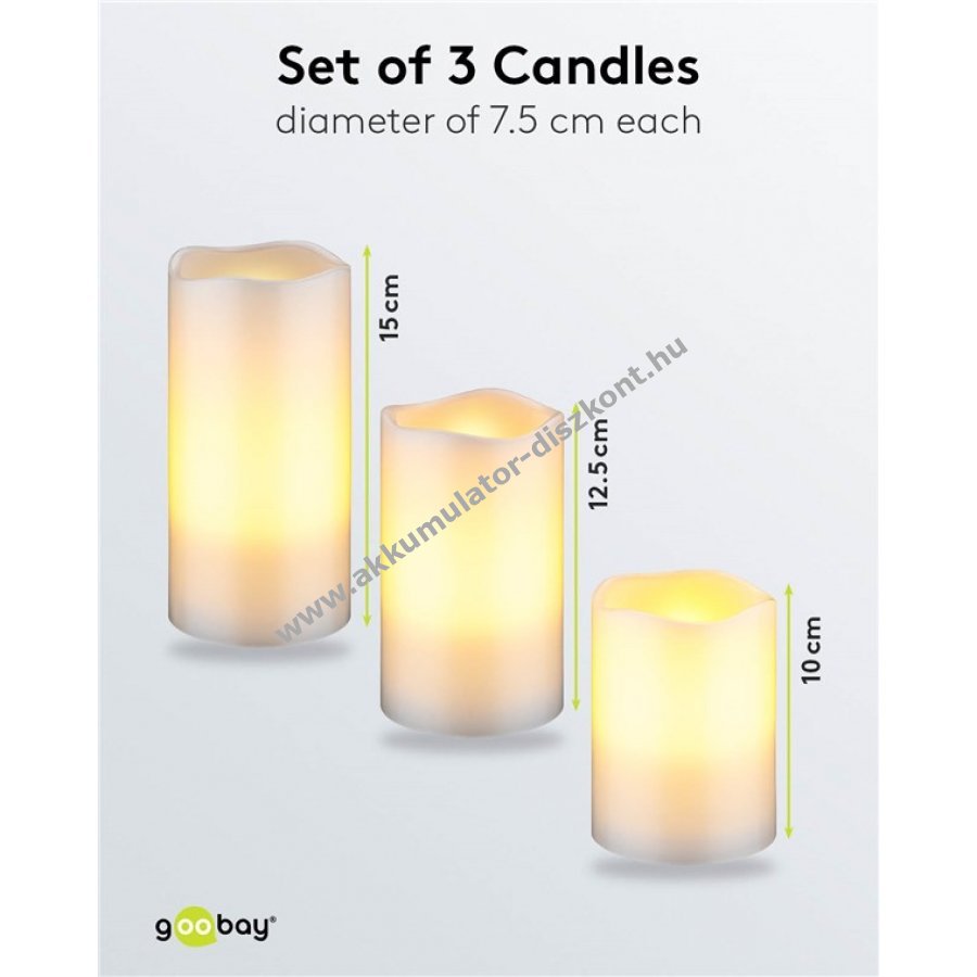 Három különböző méretű stílusos gyertya meleg, természetes pislákoló lánggal teljesen elektromosan és biztonságosan.