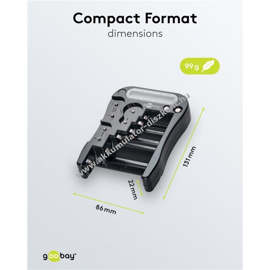 Egyszerűen használható Goobay LCD elemtesztelő, amely gyorsan megjeleníti különféle normál- és fotóelemek valamint gombcellák töltöttségi állapotát.