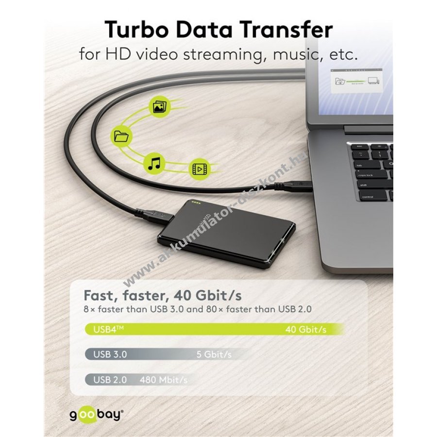 Nagysebességű USB-C kábel USB4 technológiával 40 Gbit/s adatátvitellel és 100 W teljesítmény leadással Power Delivery támogatással. Kiváló választás nagy teljesítményű laptopokhoz, dokkolókhoz és nagysebességű adattárolókhoz. 8K @ 60 Hz és 4K @ 120 Hz felbontást támogat egyedi monitorokon, két monitor esetén 4K @ 60 Hz jelátvitellel hubon keresztül.