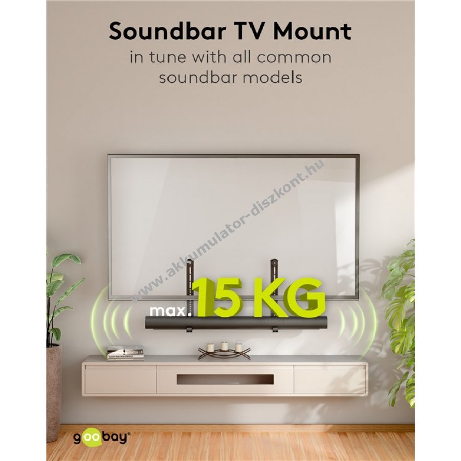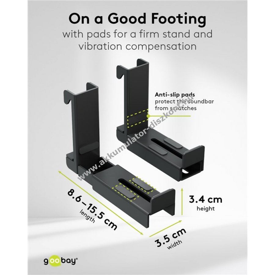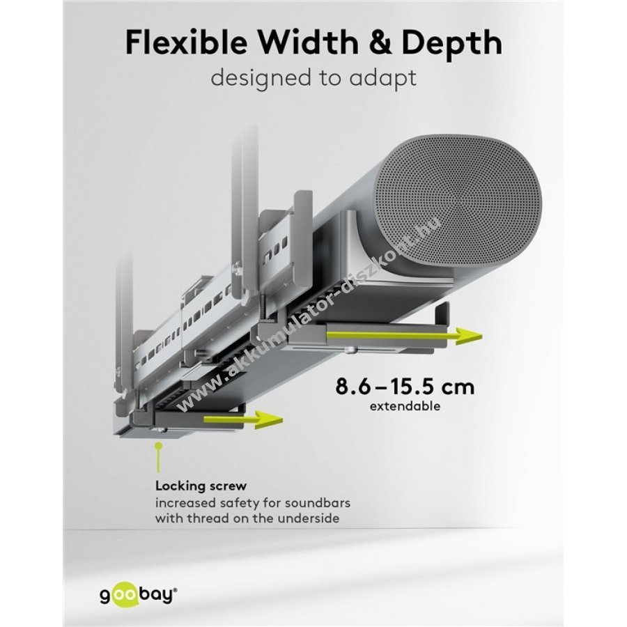 Változtatható méretű tartó a legtöbb ismert soundbarhoz 86-155 mm mélységig, például Samsung, LG, Sonos, Sennheiser, Teufel vagy JBL modellekhez.