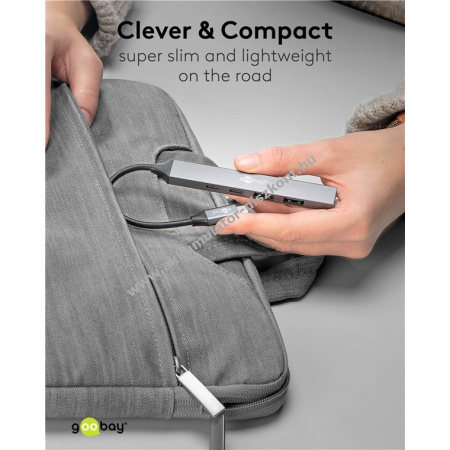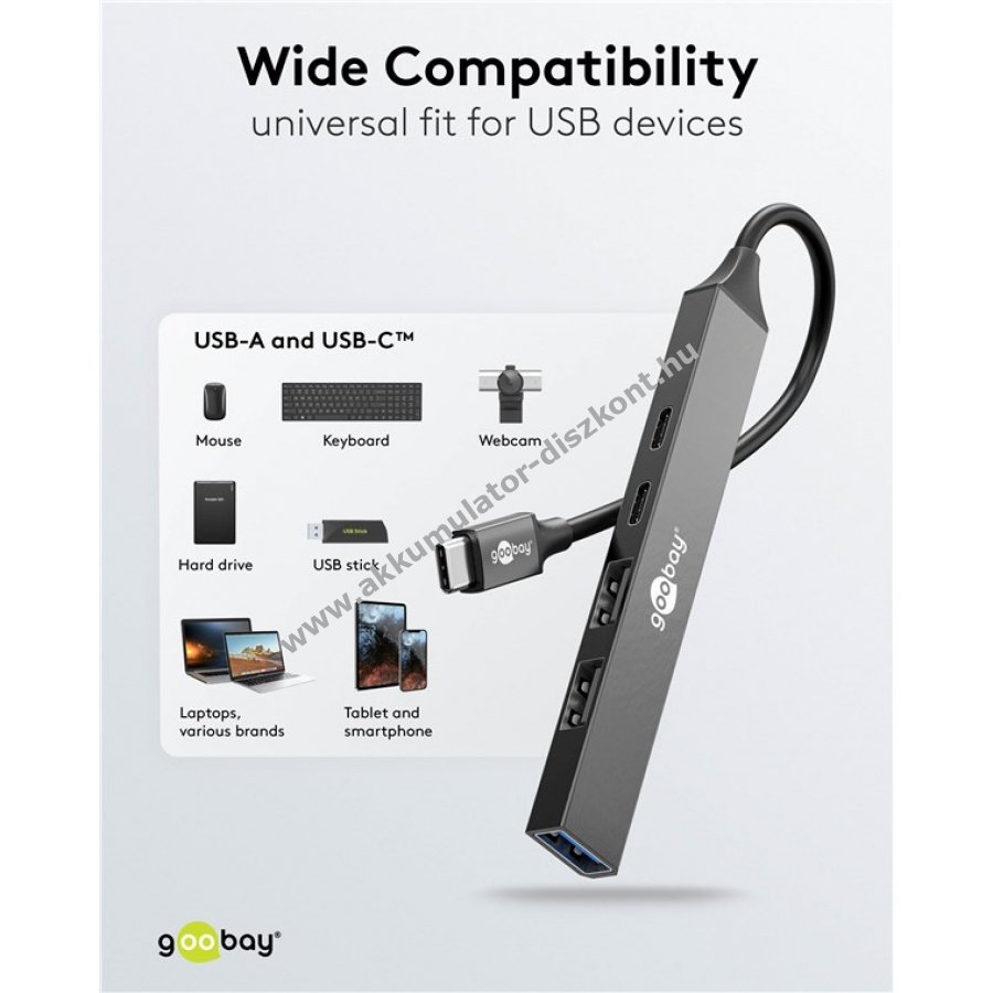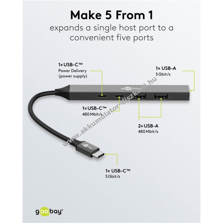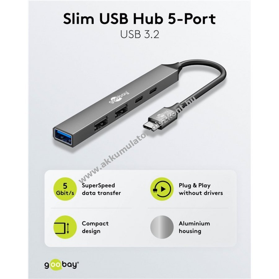 Maximális csatlakoztathatóság egy USB-C porton keresztül táblagépekhez okostelefonokhoz és laptopokhoz. A Slim hub bővíti az USB-C portot két USB-C és három USB-A csatlakozóval miközben USB 3.2 szabvány szerinti SuperSpeed adatátvitelt biztosít 5 Gbit/s sebességgel.