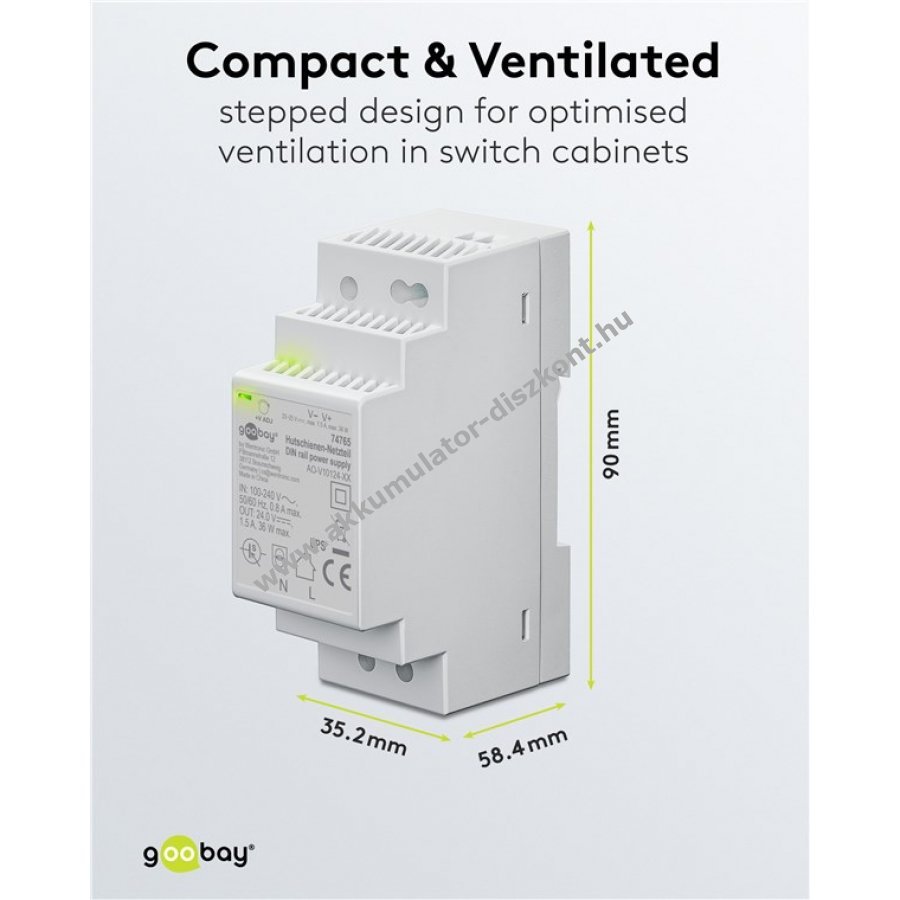 A 24V DC tápegység ideális épületautomatizáláshoz kis PLC-khez és biztonságtechnikai rendszerekhez, ahol több eszköz állandó egyenfeszültséggel és alacsony áramfelvétellel működik. Kompakt lépcsős kialakítása miatt szűk helyeken, például kapcsolószekrényekben vagy elosztódobozokban is jól használható. Alkalmas kaputelefonok, hálózatba kötött világítás, fűtés, szellőzés és riasztórendszerek vezérlésére. Különösen keskeny 35,2 mm szélességű, gyorsan és egyszerűen rögzíthető DIN-sínre kattintással. Bemeneti feszültsége 100-240V AC 50/60 Hz, kimenete állítható 20-29V DC között magas hatásfokkal. Védelmet nyújt túlfeszültség, túlterhelés és rövidzárlat ellen, IP20 védettségű, II. védelmi osztályú elektronikus szigeteléssel. Passzív konvekciós hűtéssel és érintésvédett csavaros kapcsokkal szerelt. Működését jelző folyamatosan világító LED mutatja.