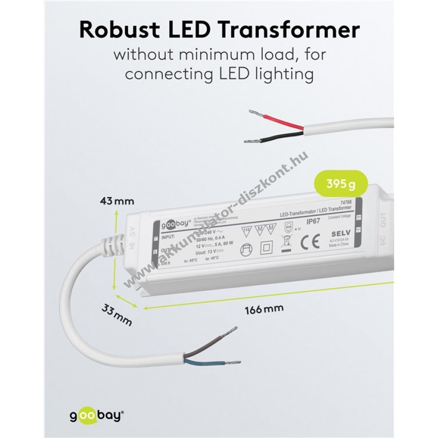 60 W teljesítményig több LED vagy LED szalag egyidejű táplálására alkalmas.