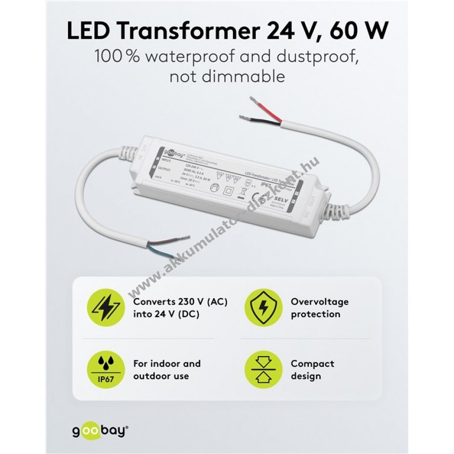 Kültéri és nedves helyiségekben használható LED trafó 24 V állandó feszültséggel. Különböző hosszúságú LED szalagok és modulok csatlakoztatására alkalmas. Nem dimmelhető.