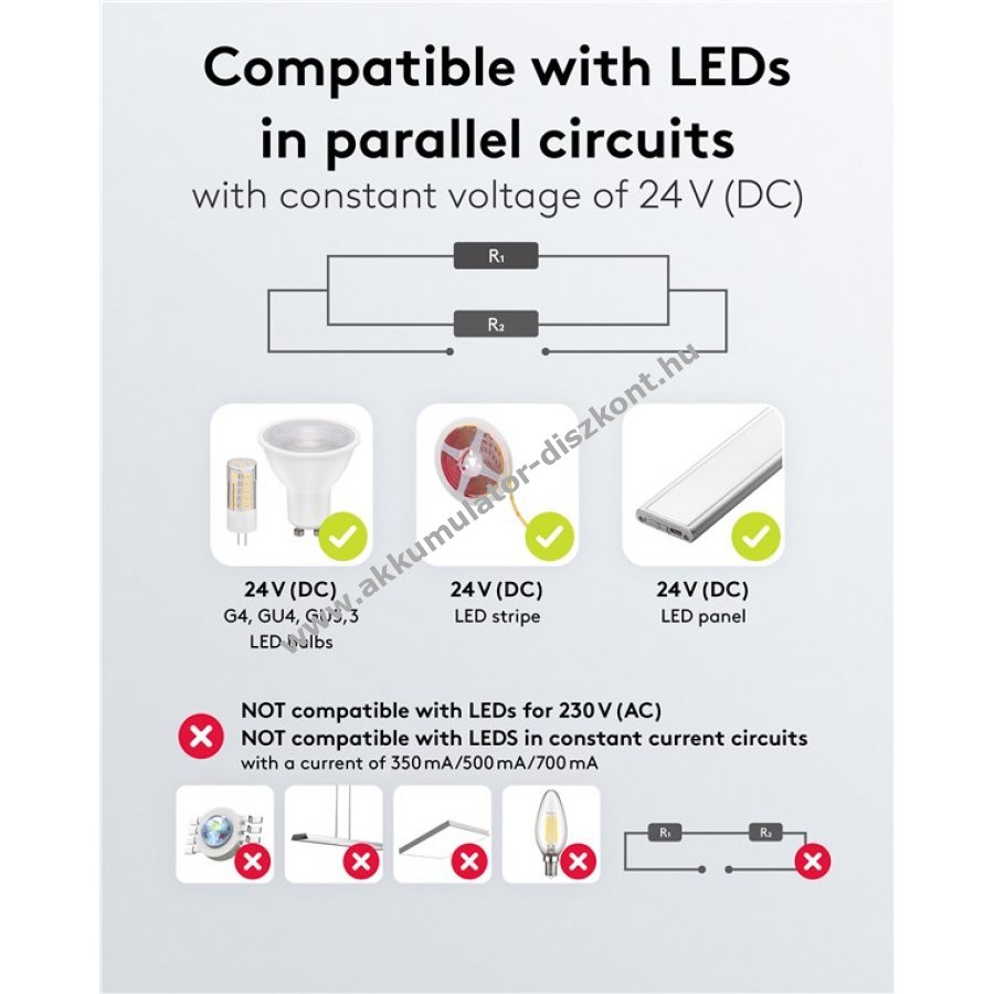 - 24 V állandó feszültség lehetővé teszi párhuzamos áramkörök és változó hosszúságú LED szalagok használatát