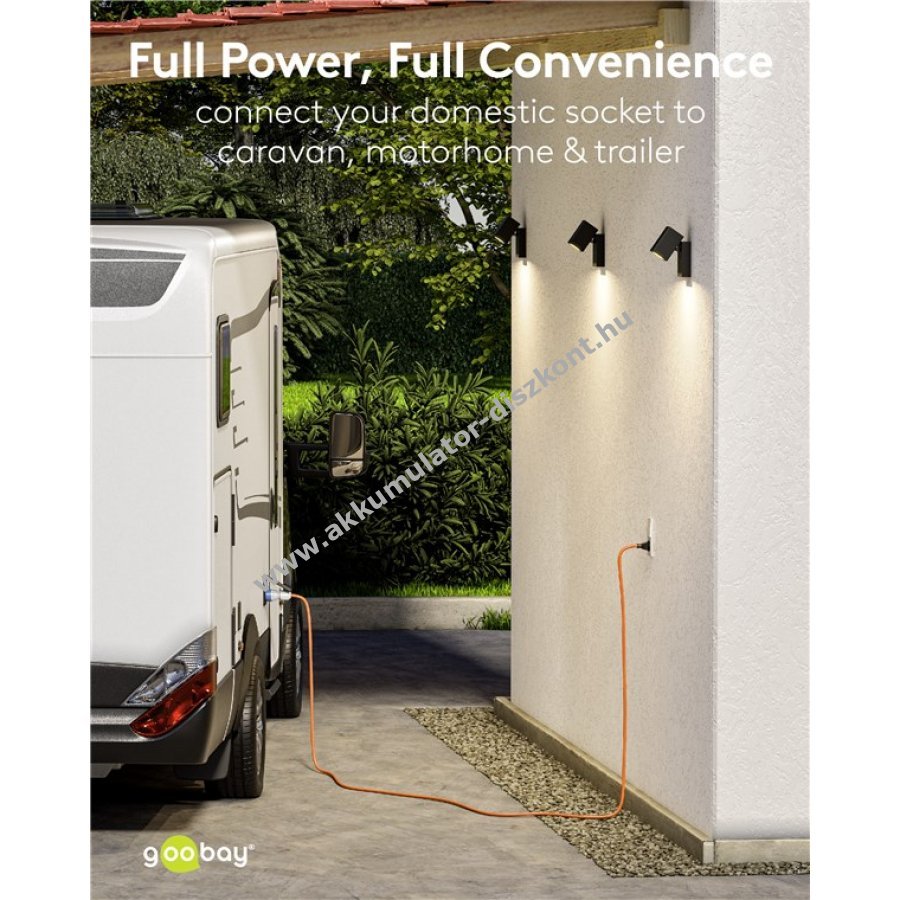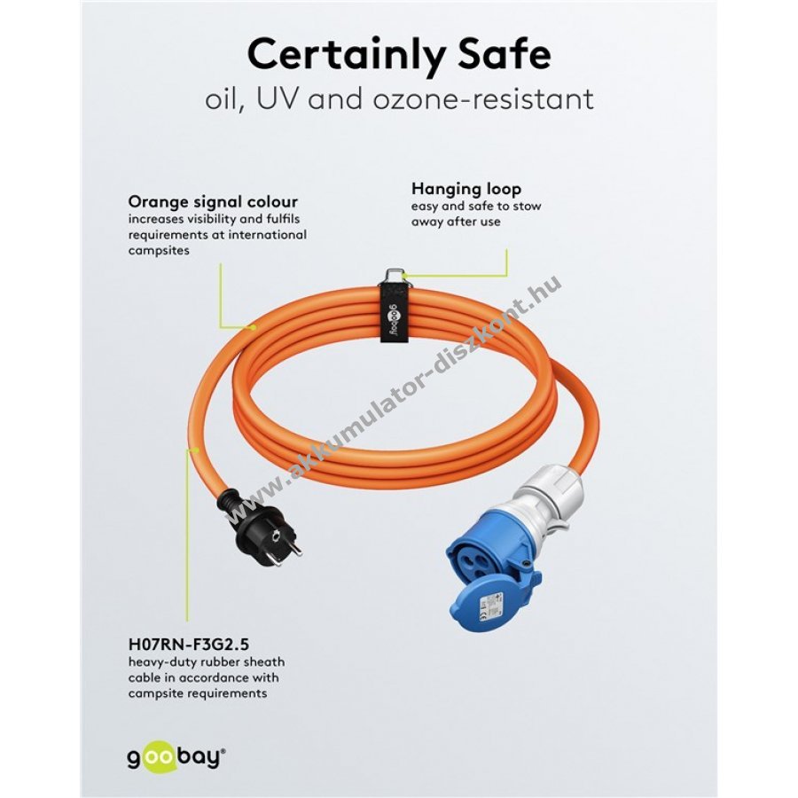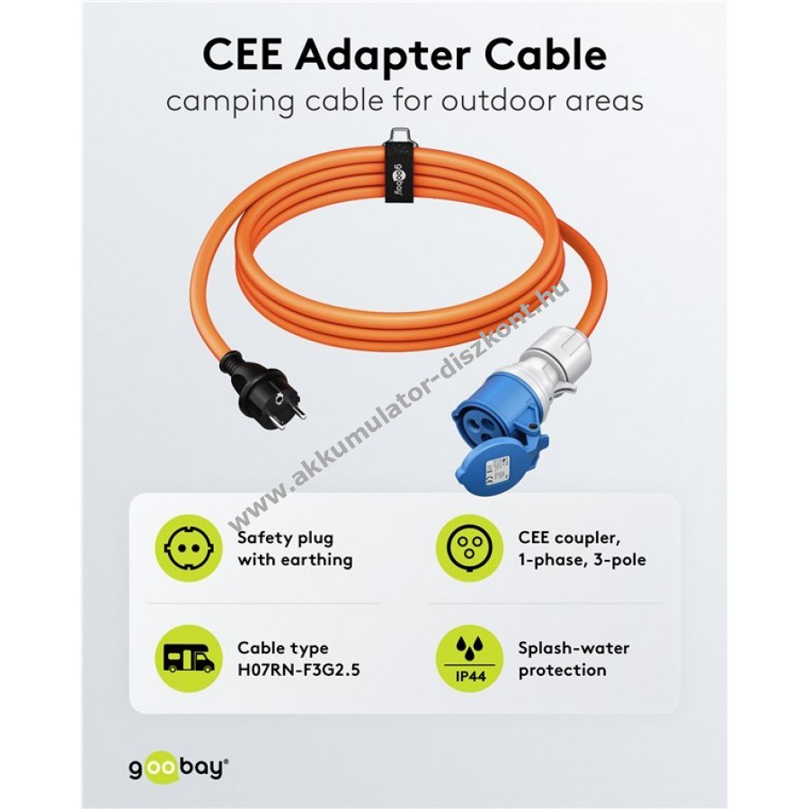Kültéri használatra tervezett CEE adapterkábel megbízható áramellátást biztosít garázsban, hobbi területen vagy privát eseményeken. IP44 védelemmel cseppálló, hosszú távú kültéri, fedett, nedves helyeken és építkezéseken használható. Az élénk narancssárga szín növeli a láthatóságot. A beépített önzáró kupak védi a csatlakozót portól, szennyeződéstől és mechanikai sérülésektől. Masszív H07RN-F 3G2,5 gumitömlő kábel 2,5 mm2 keresztmetszettel. Lakóautóban, lakókocsiban és kempingben is alkalmazható a helyi biztonsági előírások szerint. Olaj-, UV- és ózonálló. Nem polaritásbiztos.