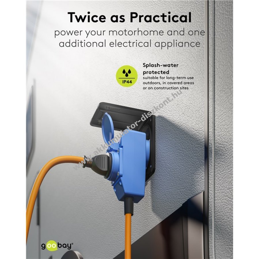 IP44 védelem fröccsenő víz ellen, hosszú távú kültéri, fedett és nedves helyeken való használatra. 90°-os szögben elfordított védőérintkezős csatlakozó kényelmesen bővíti a csatlakoztatható eszközök számát helytakarékosan.