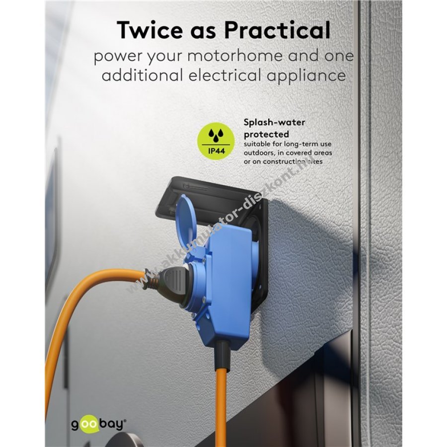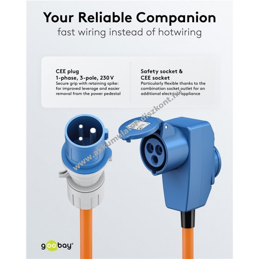 CEE adapterkábel kempinghez és kültéri használatra megbízható áramellátást biztosít lakóautóban és építkezéseken 230 V hálózatra csatlakoztatva 90°-os CEE csatlakozóval az egyszerű csatlakoztatásért és helytakarékosságért