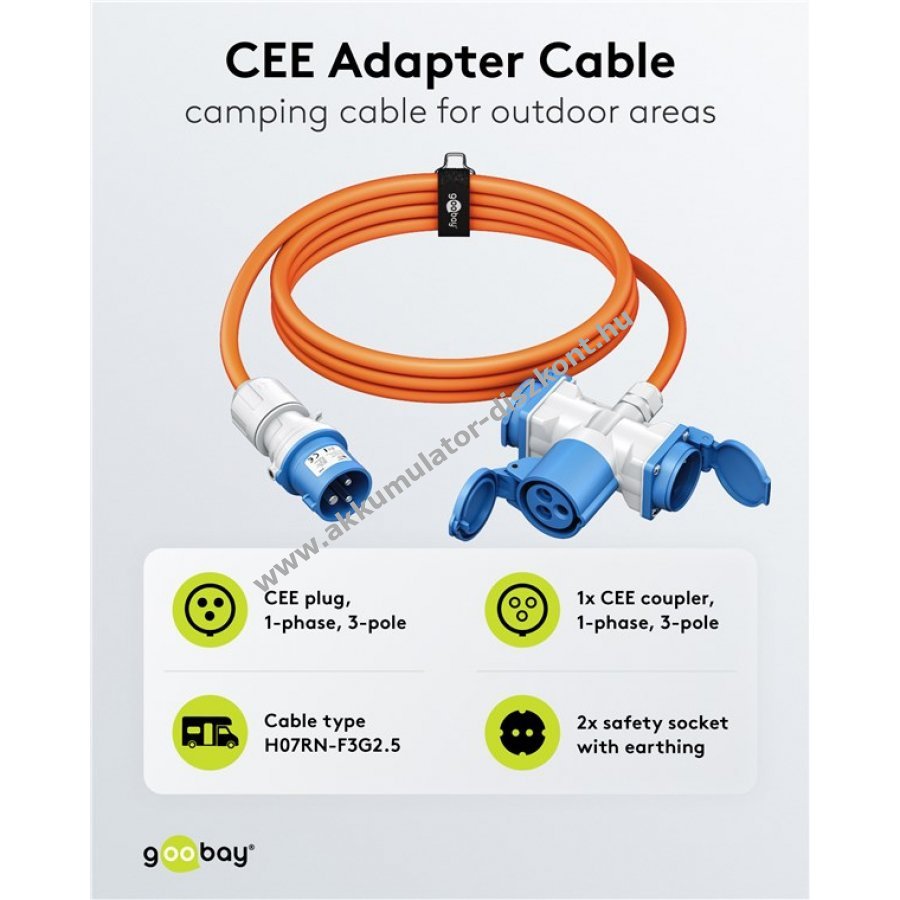 Megbízható áramellátás lakóautóhoz és kempinghasználathoz kültéren. 230 V hálózatra csatlakoztatva kényelmes energiaellátást biztosít minden kültéri eszköz számára. 3 csatlakozóval: 1x CEE aljzat és 2x védőérintkezős aljzat. 90 fokos csatlakozóval további két készülék egyszerű csatlakoztatása. IP44 védelem fröccsenő víz ellen, hosszú távú kültéri és fedett használatra, nedves helyiségekbe és munkaterületekre. Narancssárga szín a jobb láthatóságért és biztonsági előírásoknak megfelelve. Por, szennyeződés és mechanikai sérülések ellen védő önzáró kupakok a csatlakozókon. Tartós H07RN-F 3G2,5 gumitömlős kábel 2,5 mm2 keresztmetszettel, olaj-, UV- és ózonálló.
