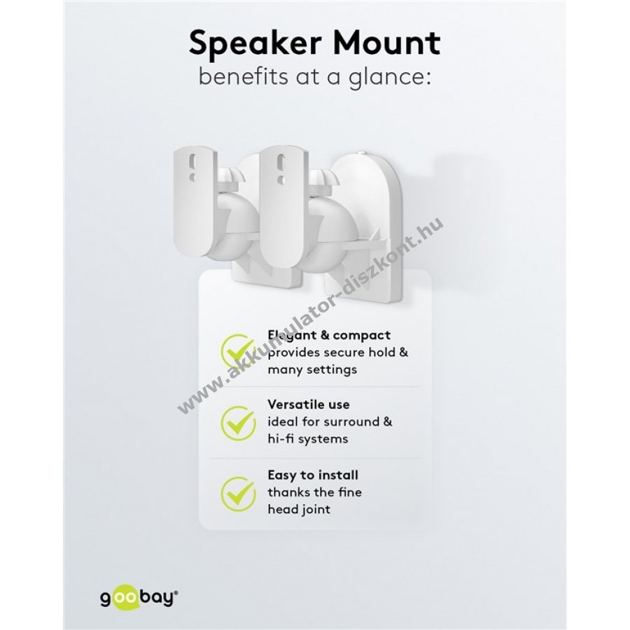 Univerzális fali tartó műholdas hangszórók egyszerű és gyors felszereléséhez. A fali lemezt rögzítve a tartó könnyen felhelyezhető a hangszóróra. A kerek fejcsuklóval szerszám nélkül állítható a kívánt pozíció. Teljes mozgásszabadság minden irányban és biztonságos rögzítés. Alkalmas 3,5 kg-ig terjedő hangszórókhoz otthoni mozirendszerekhez, surround és HiFi rendszerekhez. A hangszóró falhoz való távolsága 6,4 cm. A fejcsukló 20°-ban dönthető és 70°-ban forgatható. A rögzítő gombbal egyszerűen és szerszám nélkül rögzíthető a pozíció. A fali lemez és a rögzítő csavarok esztétikusan takarva maradnak. Kompatibilis a legtöbb ismert márka hangszóróival, például Bose B&O Canton Harman Kardon LG Magnat Philips Pioneer Samsung Sony Teufel Yamaha.