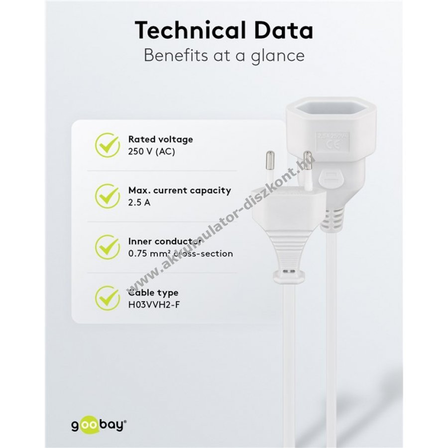 Tartós műanyagból készült kábel 2 m hosszúsággal a kényelmes elektromos készülék csatlakoztatáshoz. Univerzális hosszabbító TV-hez PC-hez projektorhoz háztartási gépekhez lámpákhoz hangszórókhoz. A lapos csatlakozó helytakarékos és rugalmas áramellátást biztosít. Csak beltéri használatra alkalmas. Fokozott érintésvédelemmel ellátott lapos kábel max 2,5 A-es eszközök csatlakoztatásához. Az eladás és használat Dániában és Svájcban tiltott.