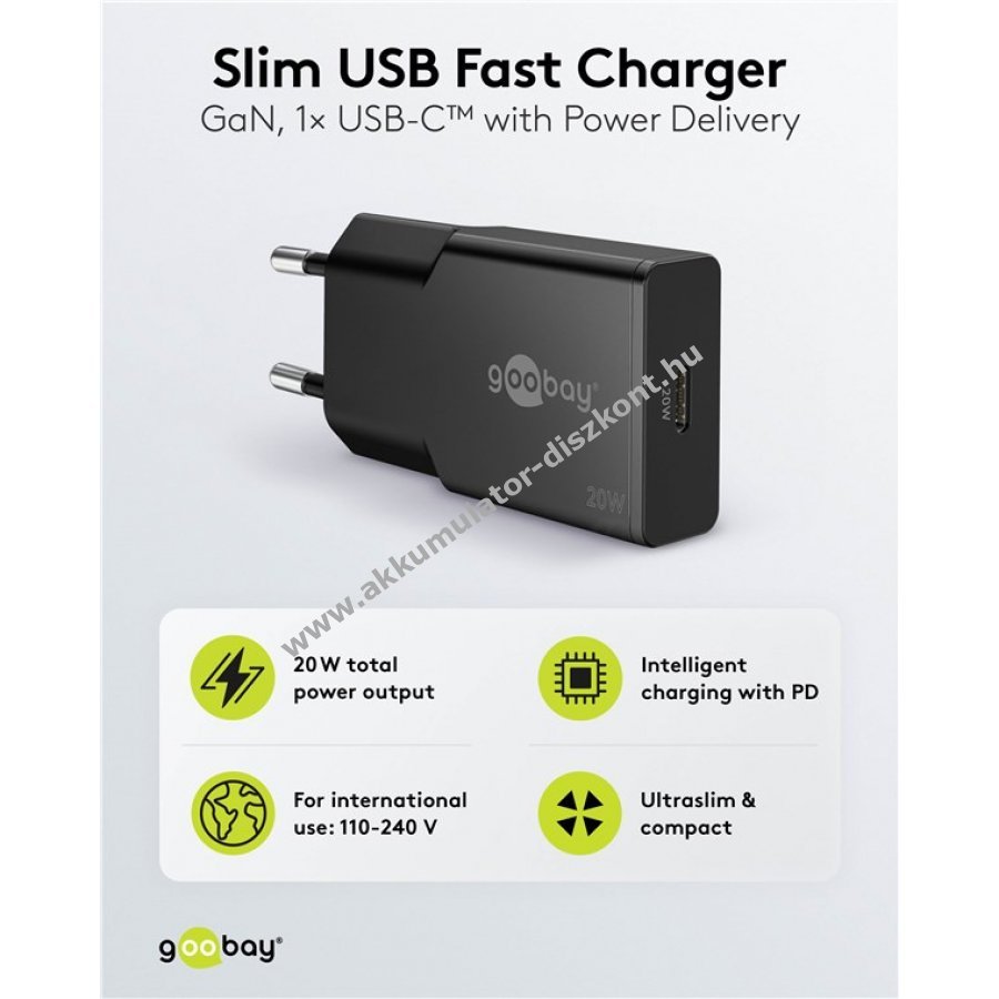 A Goobay Slim sorozat nagyon vékony töltőket kínál utazók számára. Kisméretű, így minden táskába és csomagba könnyen elfér. Ideális okostelefonok, tabletek és okosórák töltésére útközben. 20W teljesítményével kifejezetten kisebb eszközökhöz, például okostelefonokhoz, Bluetooth fülhallgatókhoz, tabletekhez vagy powerbankokhoz készült. Kompakt kialakítása miatt praktikus utazáshoz. GaN technológiájú félvezetők gyorsabb és hatékonyabb töltést tesznek lehetővé, valamint kisebb és könnyebb kialakítást biztosítanak a hagyományos töltőkhöz képest. Power Delivery támogatásával biztonságos és dinamikus töltést nyújt, amely optimalizálja a csatlakoztatott eszköz teljesítményét. Kompatibilis Apple iPhone, Samsung, Xiaomi, LG, Huawei okostelefonokkal, valamint Apple iPad és Samsung Galaxy tabletekkel. Beépített védelmi áramkör védi az eszközöket túláram, túltöltés és túlmelegedés ellen.